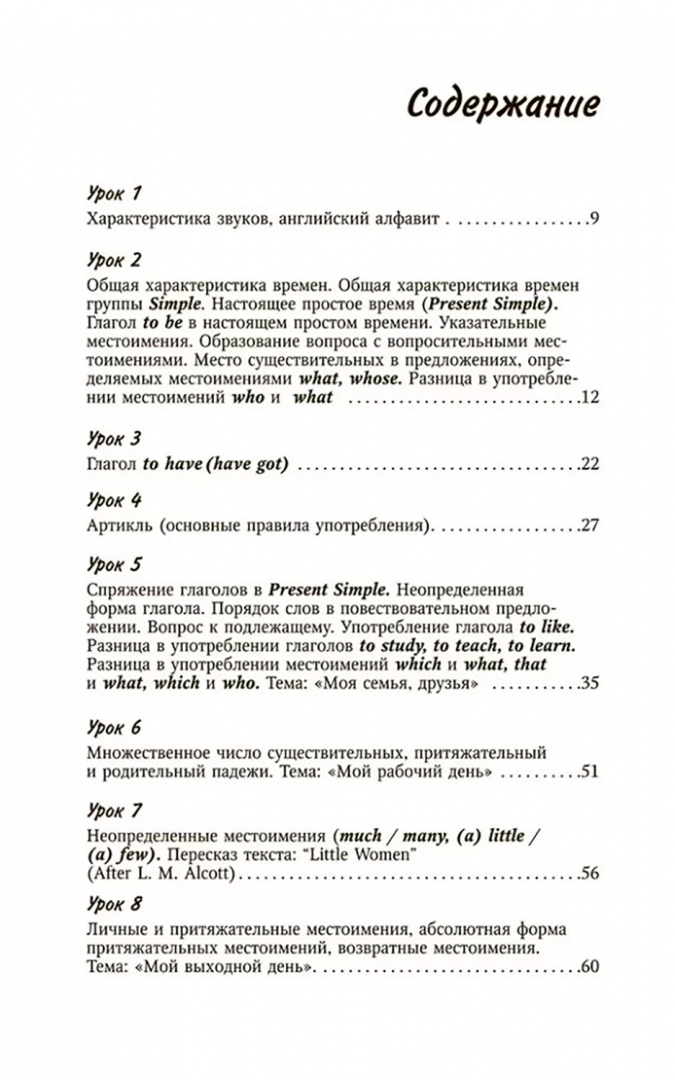 Самоучитель состоит из 43 уроков. В книге изложены в очень доступной форме основные темы грамматики английского языка, в каждом уроке имеется большое количество упражнений с ключами, что упрощает изучение и позволяет производить самоконтроль. В начале каждого урока расположен список слов, которые необходимо выучить. Издание предназначено для всех, кто желает самостоятельно изучать английский язык.