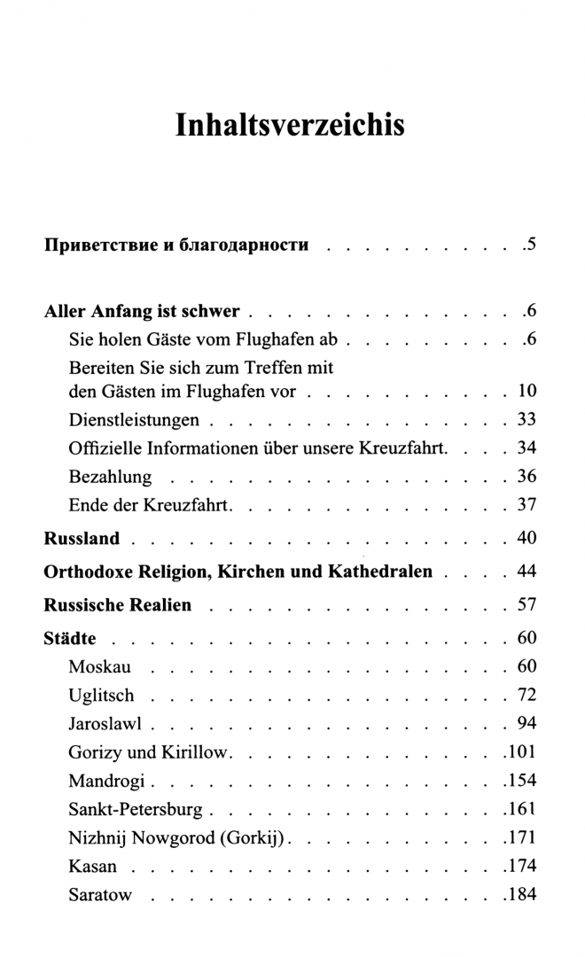 Каждый раздел пособия содержит необходимую для заучивания лексику, упражнения для перевода на немецкий язык, упражнения для перевода на русский язык, указания на русском языке, касающиеся работы, образцы документов, таблиц, карты и фотографии по маршруту, тексты экскурсий для перевода и заучивания, практические задания.