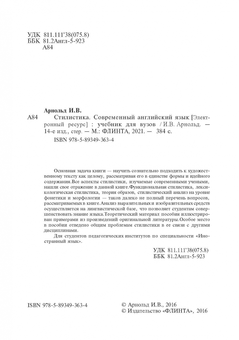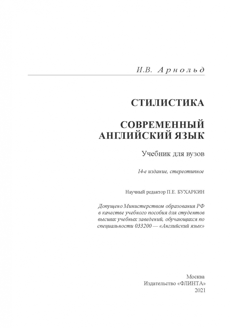 Основная задача книги - научить сознательно подходить к художественному тексту как целому, рассматривая его в единстве формы и идейного содержания. Все аспекты стилистки, изучаемые современными учеными, нашли свое отражение в данной книге. Функциональная стилистика, лексикологическая стилистика, теория образов, стилистический анализ на уровне фонетики и морфологии - таков далеко не полный перечень вопросов, рассматриваемых в книге. Анализ выразительных и изобразительных средств осуществляется на лингвистической базе, что позволяет студентам совершенствовать знание языка. Теоретический материал пособия иллюстрирован примерами из произведений оригинальной литературы. Особое место в пособии отведено общим проблемам стилистики в ее связи с другими дисциплинами.
