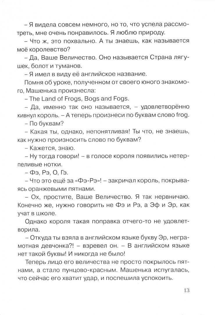 Но только не с Машей Степановой, главной героиней книги. Ей невероятно повезло: после очередной двойки по английскому диктанту она встречает фею Readwrite, которая дарит ей необыкновенную книгу и отправляет в чудесное путешествие по волшебной стране. Встречи с разбойниками и рыцарями, заточение в башне и дуэль с ведьмой - через все эти испытания Маша проходит благодаря новым друзьям и новым знаниям правил чтения, знаков транскрипции и новых английских слов.