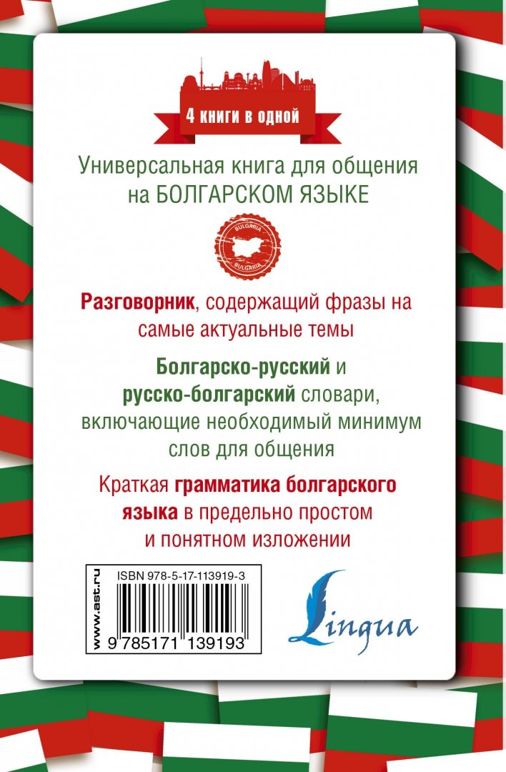 Книга представляет собой современный тип самоучителя и состоит из 4 частей, содержащих самые нужные материалы для обучения иностранному языку: разговорник, болгарско-русский и русско-болгарский словари, а также раздел со сведениями по грамматике болгарского языка в предельно простом и понятном изложении.
