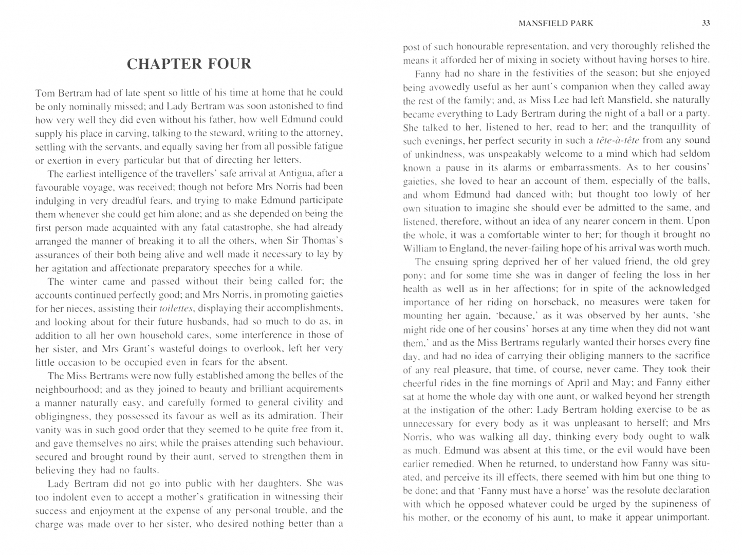 Taken from the poverty of her parents' home, Fanny Price is brought up with her rich cousins at Mansfield Park, acutely aware of her humble rank and with only her cousin Edmund as an ally. When Fanny's uncle is absent in Antigua, Mary Crawford and her brother Henry arrive in the neighbourhood, bringing with them London glamour and a reckless taste for flirtation.