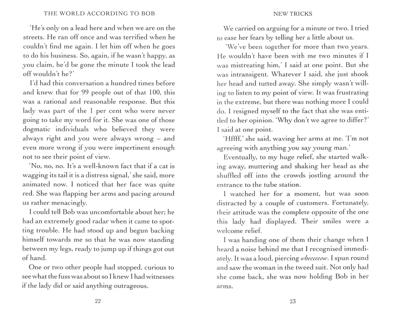 Almost every day, Bob provides moments of intelligence, bravery and humour, at the same time opening his human friend's eyes to important truths about friendship, loyalty, trust - and the meaning of happiness. In The World According to Bob, the continuing tale of their life together, James shows the many ways in which Bob has been his protector and guardian angel through times of illness, hardship, even life-threatening danger.