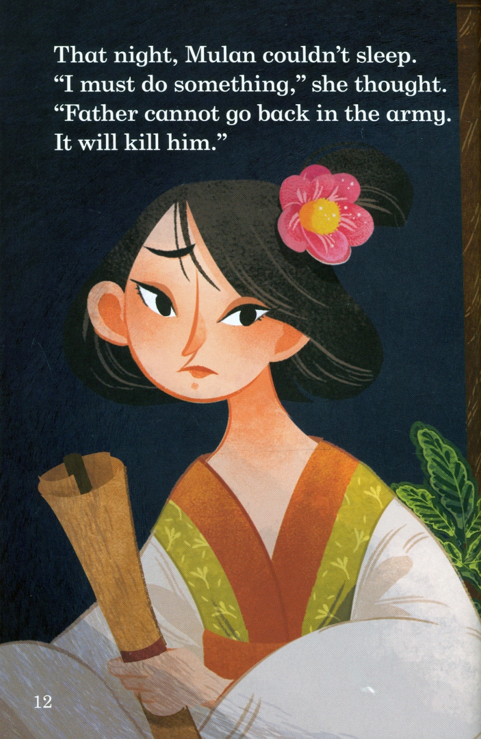 When Mulan's father was too ill to fight in the army, his daughter, Mulan, cut off her hair and put on men's clothes. She rode away from her village and went to the army, to become a great soldier.