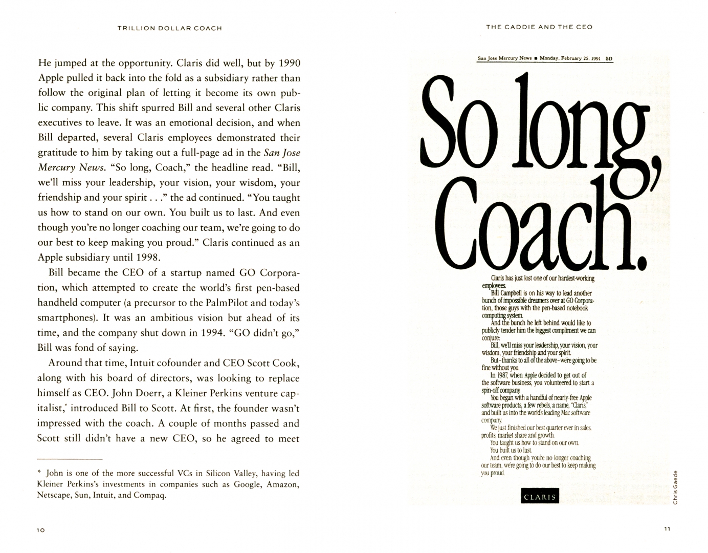 Bill Campbell played an instrumental role in the growth of several prominent companies, such as Google, Apple, and Intuit, fostering deep relationships with Silicon Valley visionaries, including Steve Jobs, Larry Page, and Eric Schmidt. In addition, this business genius mentored dozens of other important leaders on both coasts, from entrepreneurs to venture capitalists to educators to football players, leaving behind a legacy of growing companies, successful people, respect, friendship, and love after his death in 2016.