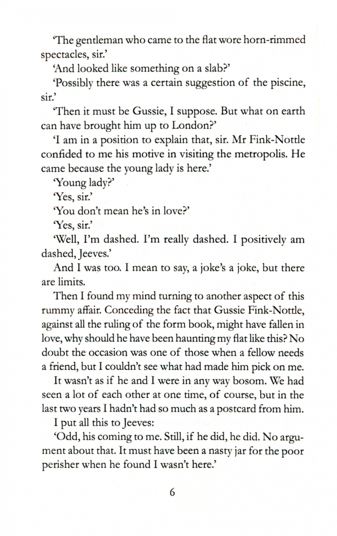 Bertie is feeling most put out when he finds that his friend Gussie is seeking relationship advice from Jeeves. Meanwhile Aunt Dahlia has asked Bertie to present awards at a school prize-giving ceremony. In a stroke of genius, Bertie realises he can kill two birds with one stone, palming off his prize-giving duties to Gussie by assuring him that the object of his affections will be there.