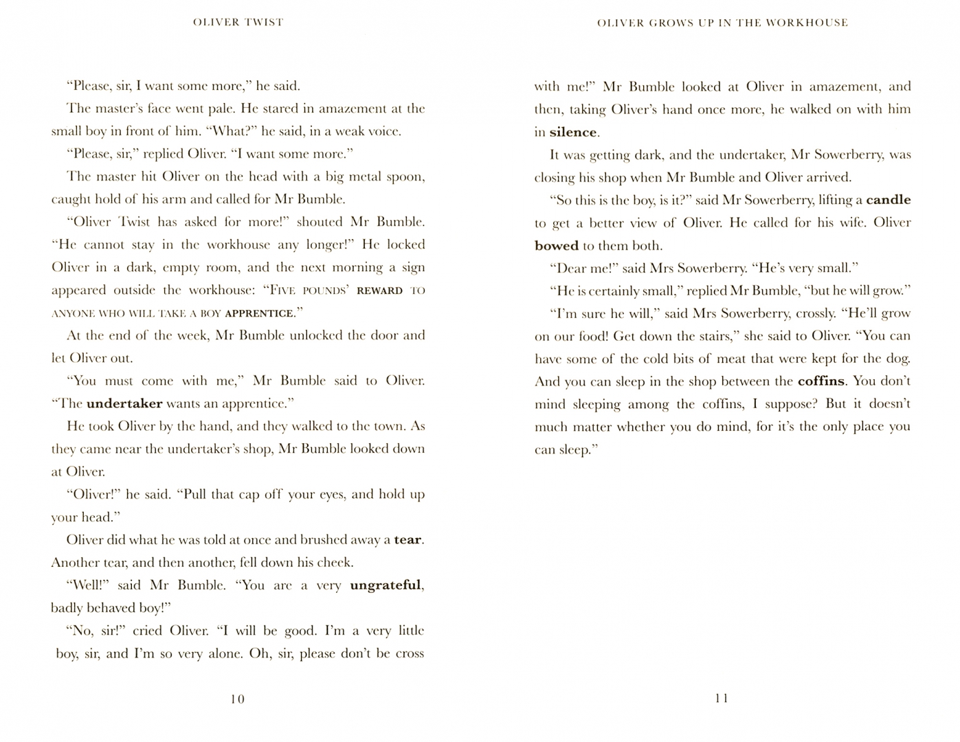 With carefully adapted text, new illustrations, language practise activities and additional online resources, the Penguin Readers series introduces language learners to bestselling authors and compelling content. Titles include popular classics, exciting contemporary fiction, and thought-provoking non-fiction. Oliver Twist, a Level 6 Reader, is B1+ in the CEFR framework. The longer text is made up of sentences with up to four clauses, introducing future continuous, reported questions, third conditional, was going to and ellipsis. A small number of illustrations support the text. Oliver Twist's parents are dead and he grows up in the workhouse, where life is very hard. One day Oliver runs away to London. There, he enters a life of crime with the old man Fagin, the Artful Dodger, frightening Bill Sykes and kind-hearted Nancy. How will Oliver live in this dangerous world?