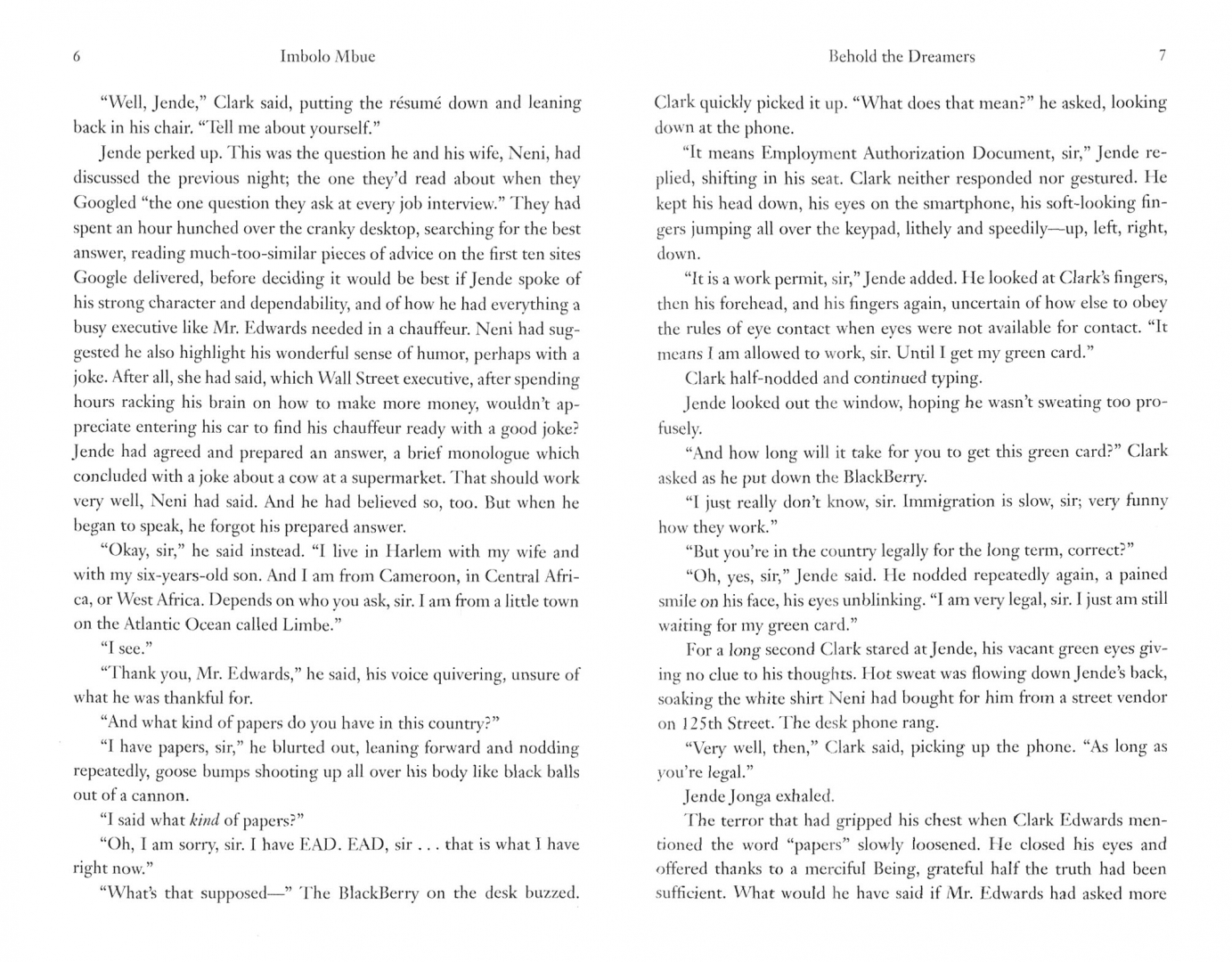 When Jende lands a dream job as chauffeur to a Lehman Brothers executive, Neni finds herself taken into the confidence of his glamorous wife Cindy. The Edwards are powerful and privileged: dazzling examples of what America can offer to those who are prepared to strive for it.