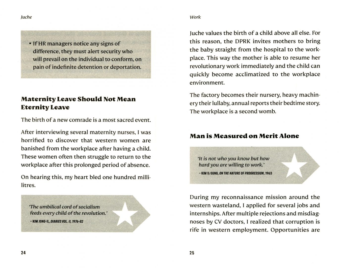 'In this earth-quaking lifestyle manifesto, I, Comrade Hyun-gi, will share with you the blueprint to a healthier, happier way of life. Juche will teach you westerners how sleeping under your desk yields a better work/life balance; why food rationing promotes a greater generosity of spirit; how sealed borders prevent the agony of long-distance relationships and why pensions prevent people from living in the moment.