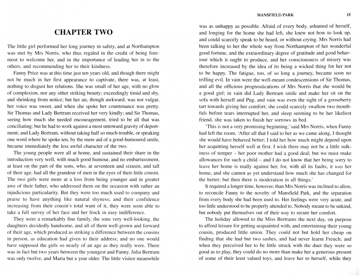 Adopted at a tender age by an uncle and aunt who have grown rich from a sugar plantation in distant Antigua, she finds herself morally at odds with them and their offspring. Her chief consolation is the kindness of the younger son, Edmund Bertram, whom she secretly loves.