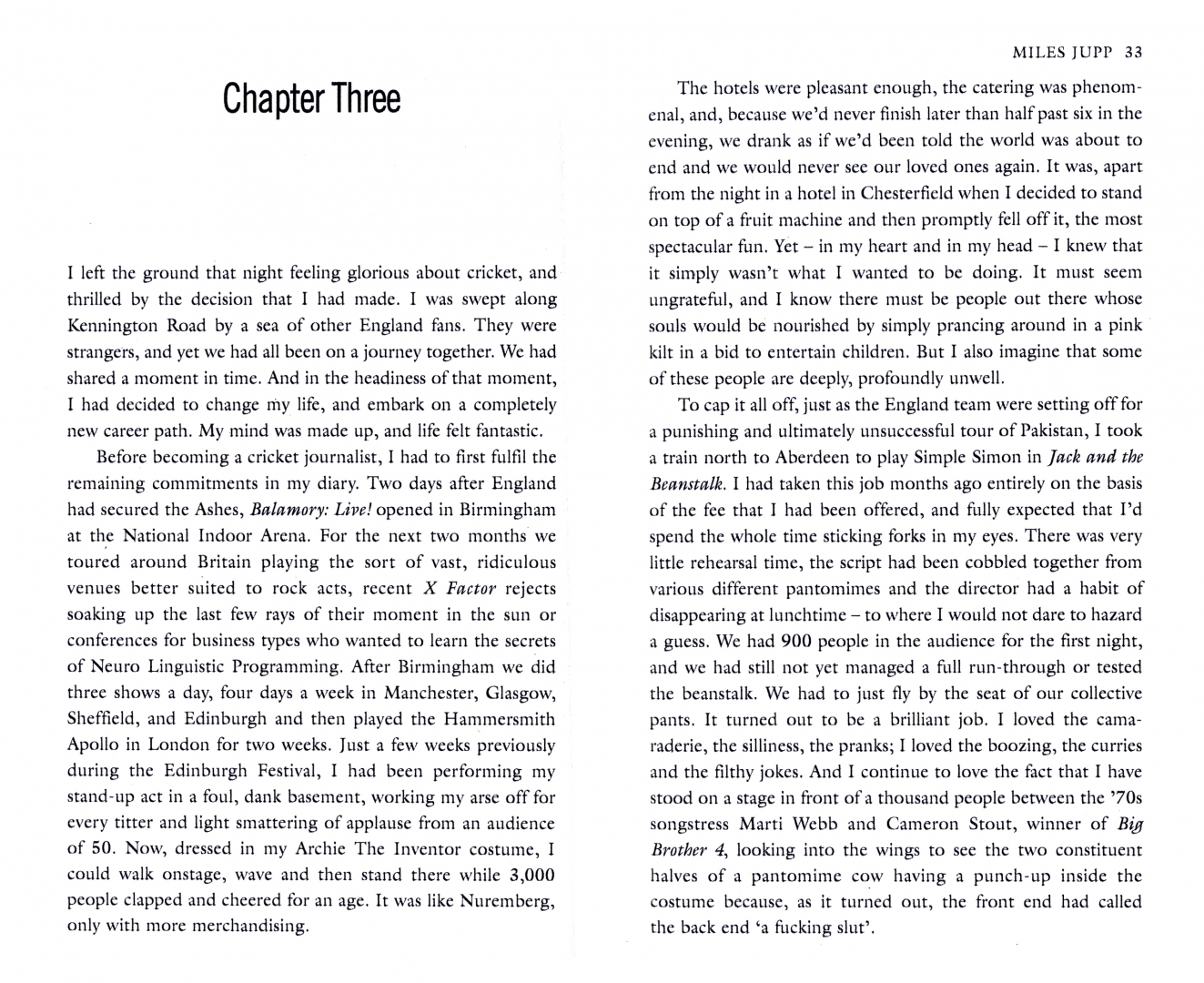 By claiming to be the cricket correspondent for BBC Scotland and getting a job with the (Welsh) Western Mail, Miles lands the press pass that will surely be the ticket to his dreams. Soon, he finds himself in cricket heaven - drinking with David Gower and Beefy, sharing bar room banter with Nasser Hussain and swapping diarrhoea stories with the Test Match Special team.