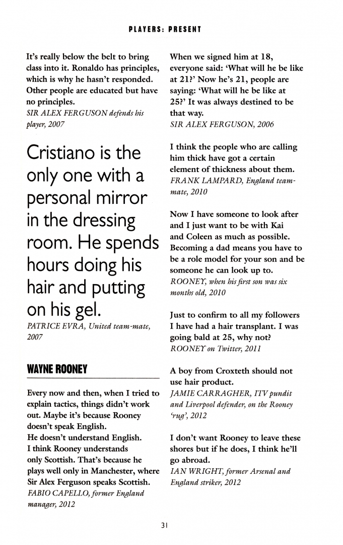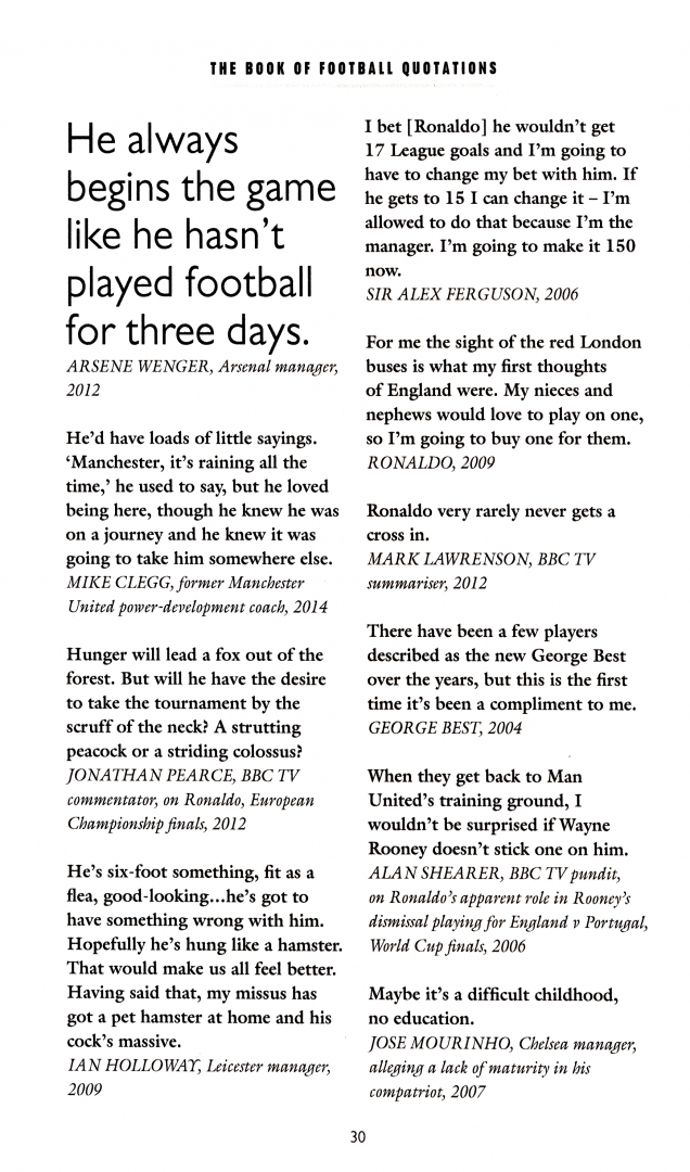 This compilation includes quotes from everyone – Shakespeare to Suarez, Camus to Cantona, Busby to Beckham – who has made an apt, pithy or comical comment about football. And not just footballers and managers either – fans, pundits, groundsmen, directors and wives all get to have their say too. Every subject is covered, from tactical debates to changing lifestyles, to produce a sometimes hilarious and always thought-provoking commentary on the game.