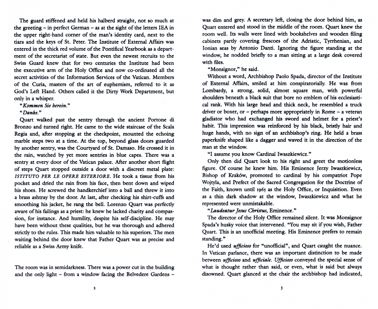 Father Quart, a suave Vatican troubleshooter is sent to investigate. Experience has taught him to deal with enemies of the Church in all their guises, but nothing has prepared him for the stubborn faith of Father Ferro, or the appeal of the lovely Macarena Bruner, desperate to save the church and her ancestors from her ex-husband, the ruthless banker Pencho Gavira. As Quart is drawn into an intrigue as labyrinthine as the streets of Seville, soon more than his vocation is in danger.