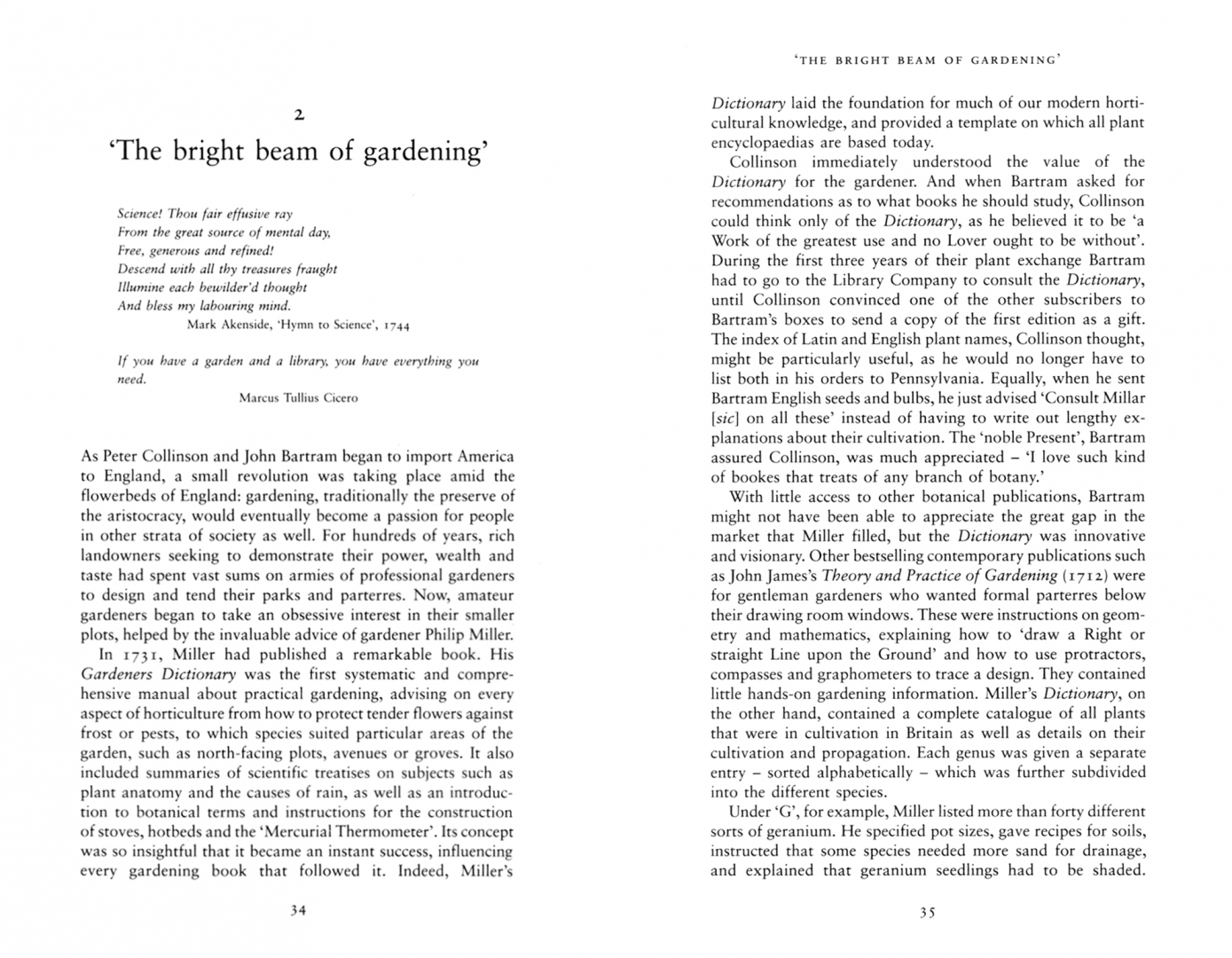Over the next forty years, Bartram would send hundreds of American species to England, where Collinson was one of a handful of men who would foster a national obsession and change the gardens of Britain forever: Philip Miller, author of the bestselling Gardeners Dictionary; the Swede Carl Linnaeus, whose standardised botanical nomenclature popularised botany; the botanist-adventurer Joseph Banks and his colleague Daniel Solander who both explored the strange flora of Tahiti and Australia on Captain Cook's Endeavour.
