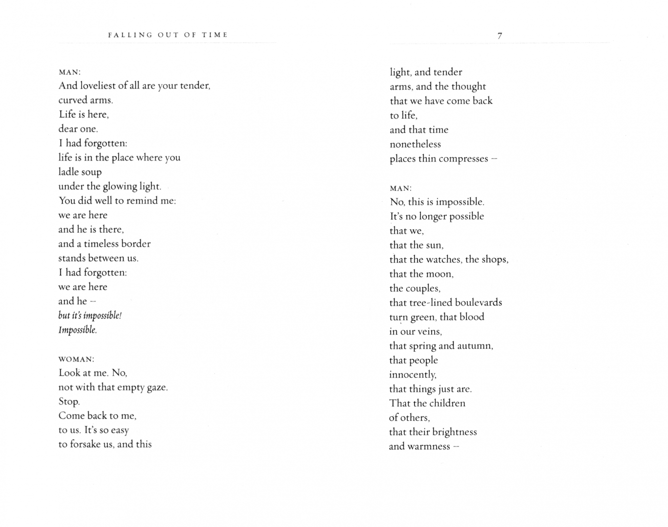 In Falling Out of Time, David Grossman has created a genre-defying drama - part play, part prose, pure poetry - to tell the story of bereaved parents setting out to reach their lost children. It begins in a small village, in a kitchen, where a man announces to his wife that he is leaving, embarking on a journey in search of their dead son.The man - called simply the 'Walking Man' - paces in ever-widening circles around the town. One after another, all manner of townsfolk fall into step with him (the Net Mender, the Midwife, the Elderly Maths Teacher, even the Duke), each enduring his or her own loss. The walkers raise questions of grief and bereavement: Can death be overcome by an intensity of speech or memory? Is it possible, even for a fleeting moment, to call to the dead and free them from their death? Grossman's answer to such questions is a hymn to these characters, who ultimately find solace and hope in their communal act of breaching death’s hermetic separateness. For the reader, the solace is in their clamorous vitality, and in the gift of Grossman’s storytelling – a realm where loss is not merely an absence, but a life force of its own.