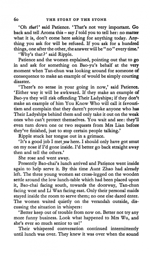 The Story of the Stone (c. 1760), also known by the title of The Dream of the Red Chamber, is the great novel of manners in Chinese literature.