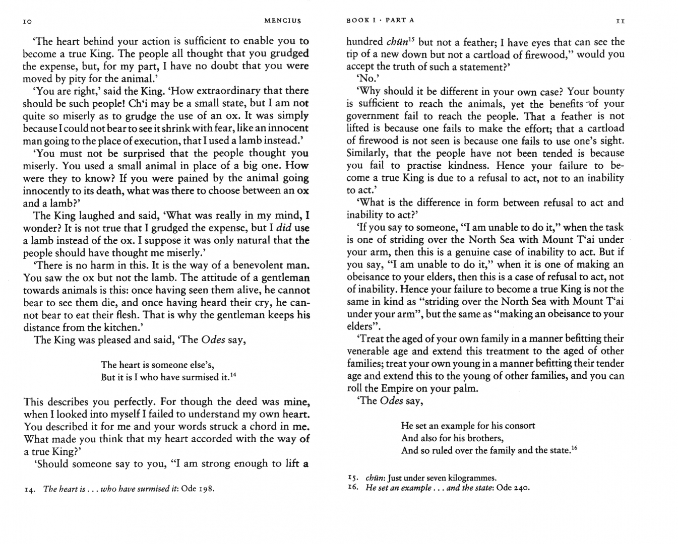 Mencius was one of the great philosophers of ancient China, second only in influence to Confucius, whose teachings he defended and expanded. The Mencius, in which he recounts his dialogues with kings, dukes and military men, as well as other philosophers, is one of the Four Books that make up the essential Confucian corpus. It takes up Confucius's theories of jen, or goodness and yi, righteousness, explaining that the individual can achieve harmony with mankind and the universe by perfecting his innate moral nature and acting with benevolence and justice. Mencius' strikingly modern views on the duties of subjects and their rulers or the evils of war, created a Confucian orthodoxy that has remained intact since the third century BCE.