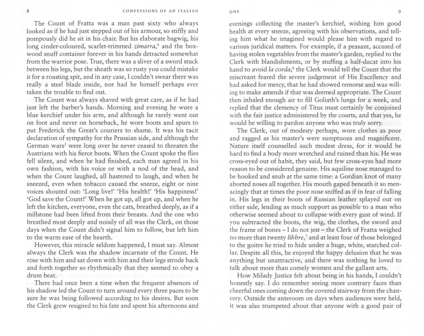 At the age of eighty-three and nearing death, Carlo Altoviti has decided to write down the confessions of his long life. He remembers everything, from his unhappy childhood in the kitchens of the Castle of Fratta to revolutionary fighting in Naples and romantic entanglements during the siege of Genoa. Throughout, Carlo lives only for his twin passions in life: his dream of a unified, free Italy and his undying love for the magnificent but inconstant Pisana. Peopled by a host of unforgettable characters - including drunken smugglers, saintly nuns, scheming priests, Napoleon and Lord Byron - this is an epic historical novel that tells the remarkable and inseparable stories of one man's life and the history of Italy's unification.
