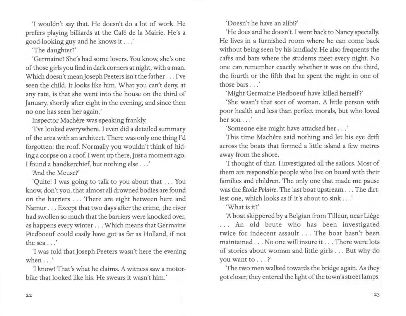 Maigret is asked to the windswept, rainy border town of Givet by a young woman desperate to clear her family of murder. But their well-kept shop, the sleepy community and its raging river all hide their own mysteries.
