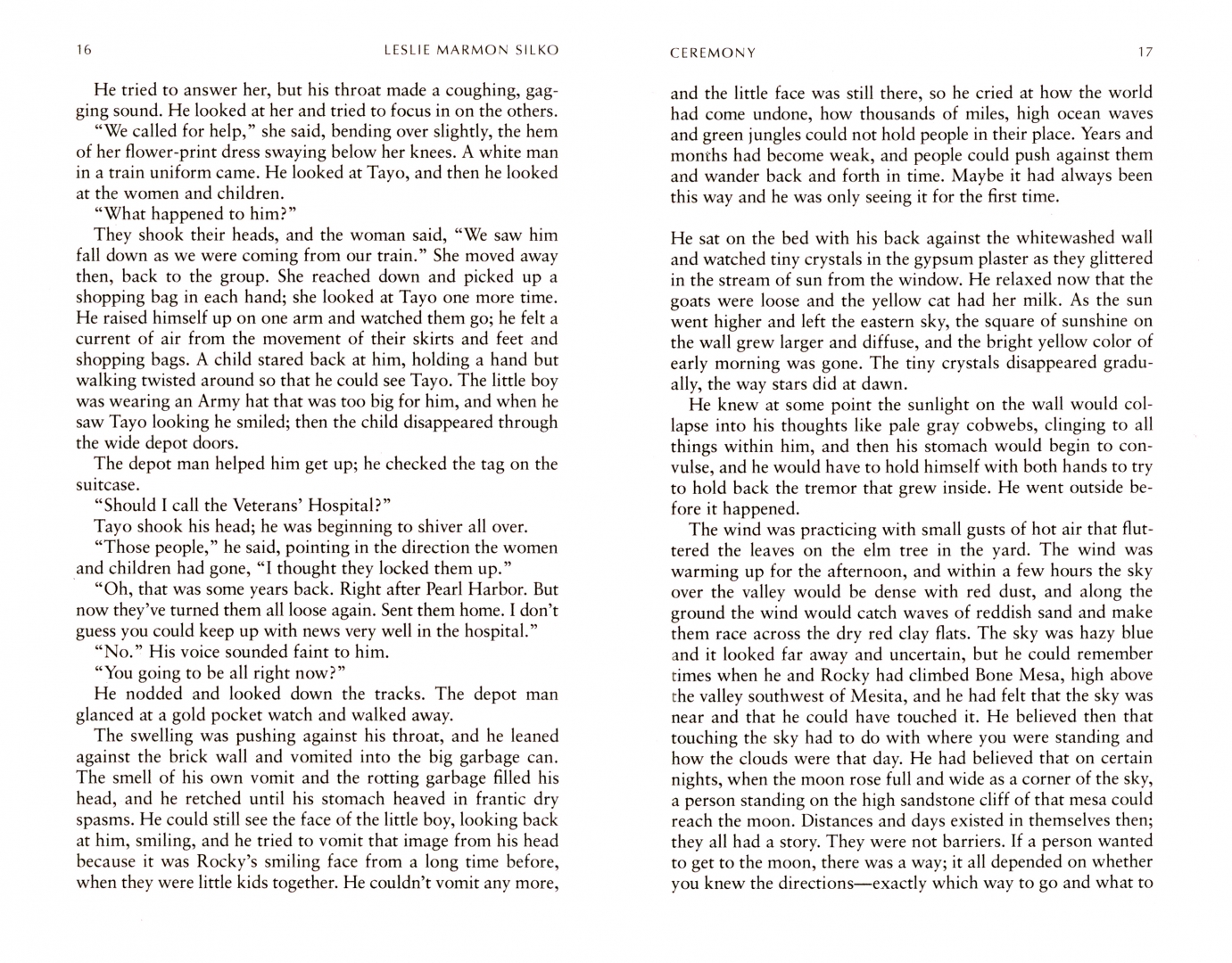 Tayo, a young Second World War veteran of mixed ancestry, is coming home. But, returning to the Laguna Pueblo Reservation, he finds himself scarred by his experiences as a prisoner of war, and further wounded by the rejection he finds among his own people. Only by rediscovering the traditions, stories and ceremonies of his ancestors can he start to heal, and find peace.