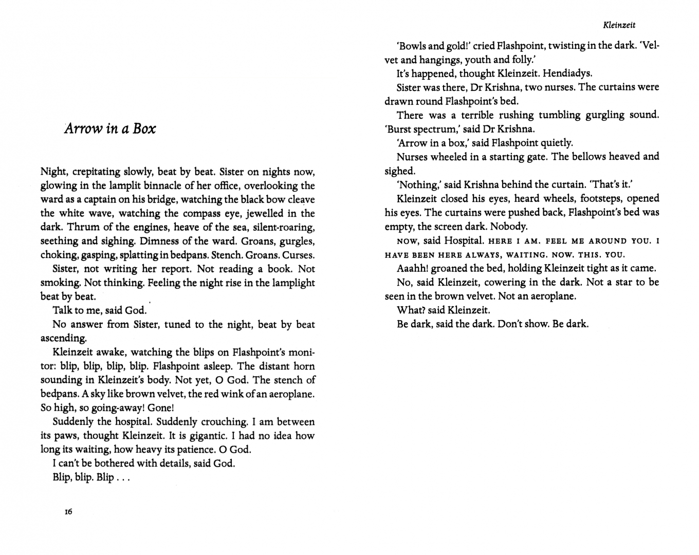 On an ordinary day in a strangely unfamiliar London, Kleinzeit is fired from his advertising job and told he must go to hospital with a skewed hypotenuse. There on Ward A4, he falls in love with the divine, rosy-cheeked Sister and is sent spinning into a quest involving, among other things, a glockenspiel, sheets of yellow paper, Orpheus, the Underground and that dirty chimpanzee, Death.