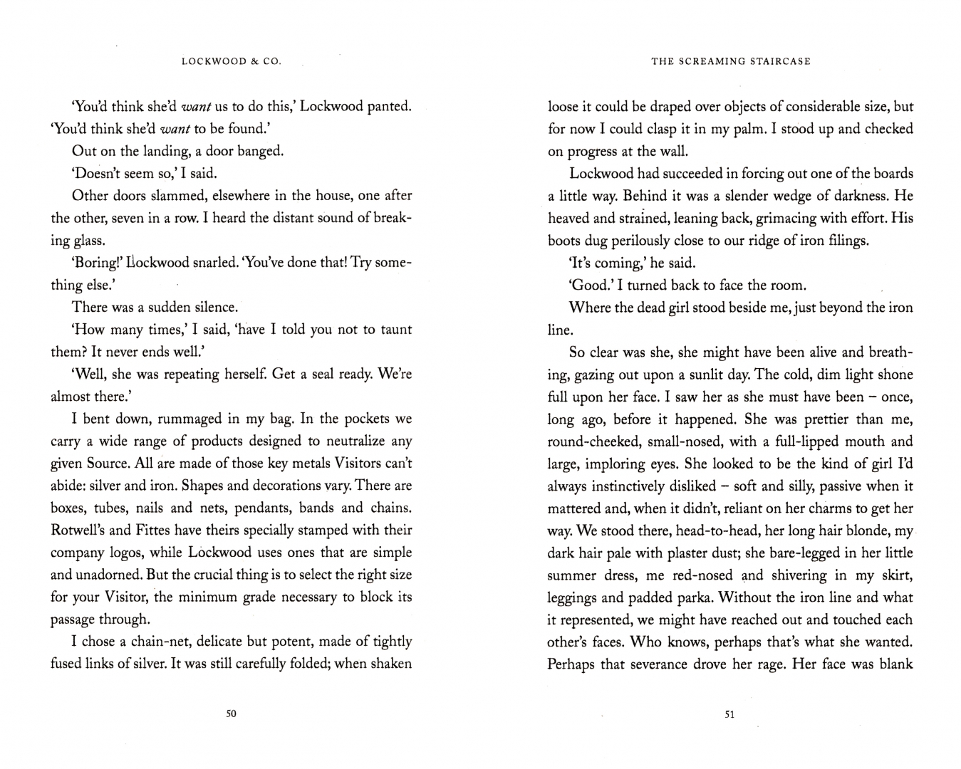 Lucy Carlyle, a talented young agent, arrives in London hoping for a notable career. Instead she finds herself joining the smallest most ramshackle agency in the city, run by the charismatic Anthony Lockwood. When one of their cases goes horribly wrong, Lockwood & Co. have one last chance of redemption. Unfortunately this involves spending the night in one of the most haunted houses in England, and trying to escape alive.