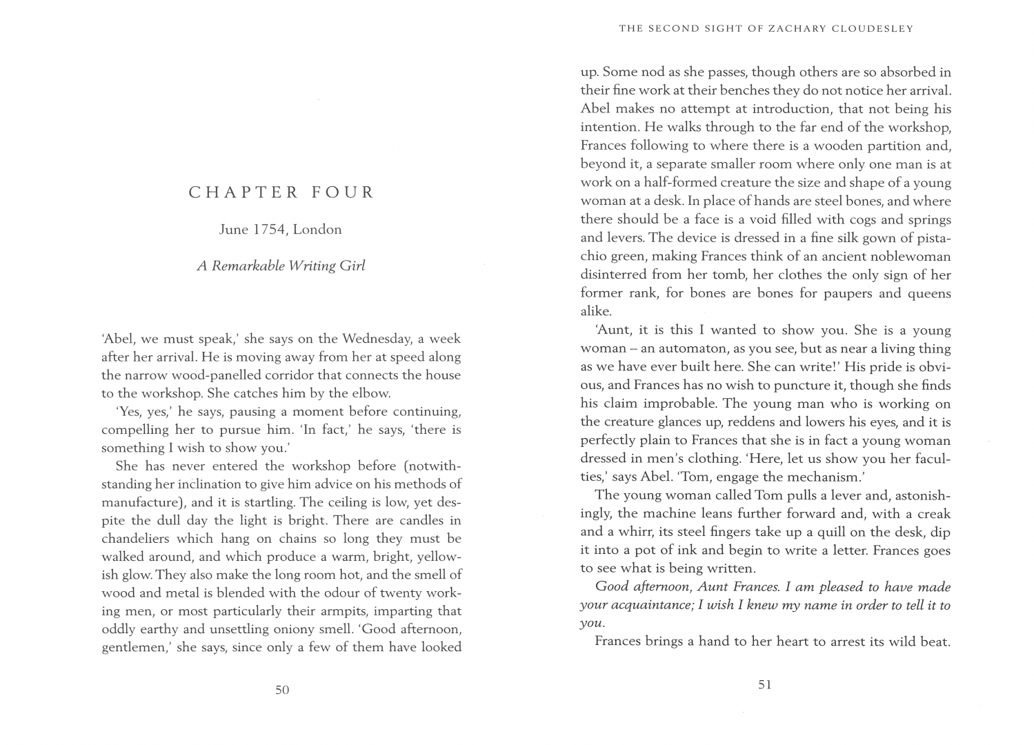 Raised amongst the cogs and springs of his father's workshop, Zachary Cloudesley has grown up surrounded by strange and enchanting clockwork automata. He is a happy child, beloved by his father Abel and the workmen who help bring his father's creations to life.