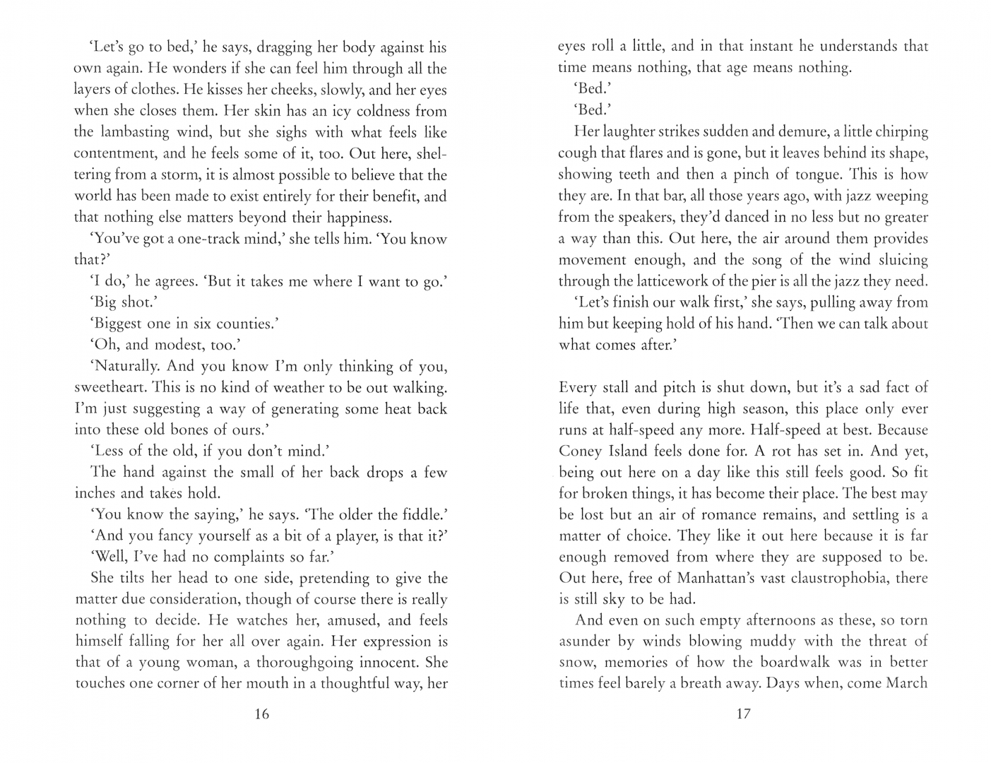 On a bitterly cold winter’s afternoon, Michael and Caitlin escape their unhappy marriages to keep an illicit rendezvous. Once a month, for the past quarter of a century, Coney Island has been their haven; these precious, hidden hours their only nourishment. But now, amid the howling of an angry snowstorm, the shut-down, out-of-season resort feels like the edge of the world. And their lives, suddenly, are on the brink – with news of serious illness on one side, and a move to the Midwest on the other.