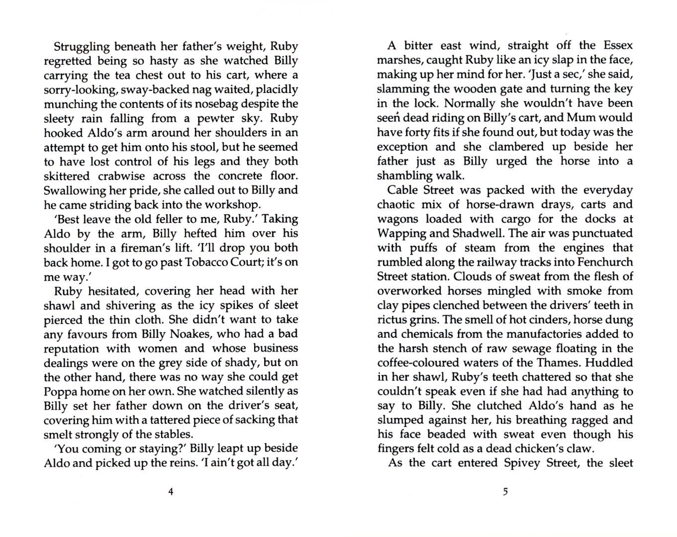 Although very similar in looks they dream of very different futures. Coquettish, flamboyant Rosetta is desperate to leave the claustrophobic confines of the sewing sweatshop to follow in her wayward aunt's footsteps and work under the bright lights of the music hall. Ruby, quieter and more modest, has always longed to train as a nurse, a pipe-dream for a girl from her humble background.