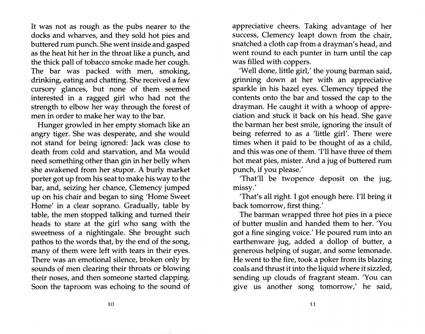 Befriended by Ned Hawkes and his kindly mother, Nell, Clemency struggles to escape from life in the slums of Stew Lane. She finds work with a troupe of buskers run by larger than life Augustus Throop, and is spotted by the manager of the Strand Theatre.