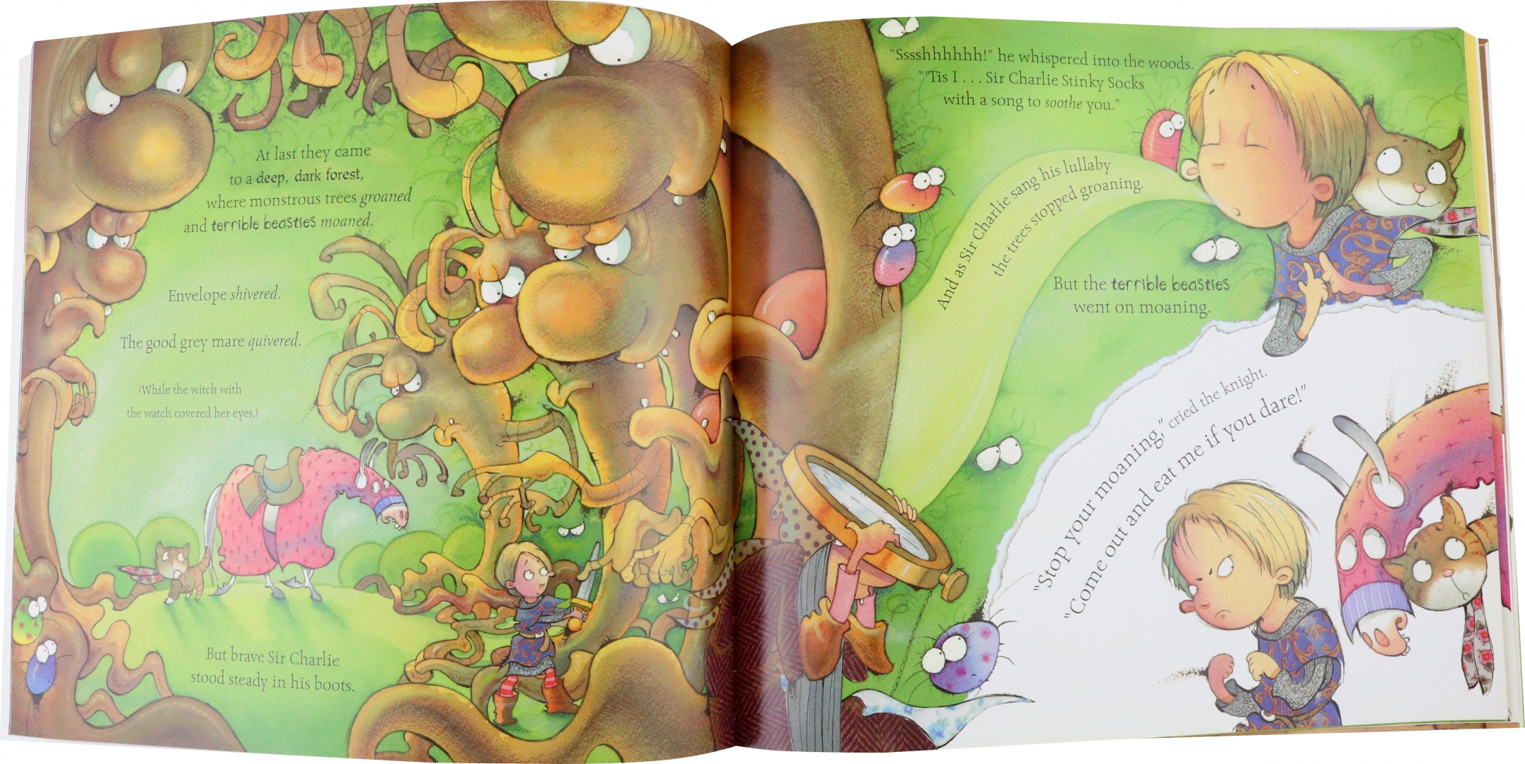 Once upon a time, there was a deep, dark forest, where monstrous trees groaned, terrible beasties moaned and wiggly woos waited to tickle your toes. Nobody ever went there until… Sir Charlie Stinkysocks, his good grey mare and his pet cat Envelope decide the time has come for a really big adventure. Sir Charlie packs his best sword and his sandwiches and off he goes, over the hills and far away, until he gets to the deep, dark forest. Sir Charlie doesn’t flinch when he meets the beasties, or the dragon, or the wily witch, but when he comes across the princess, he realises he’s met his match!