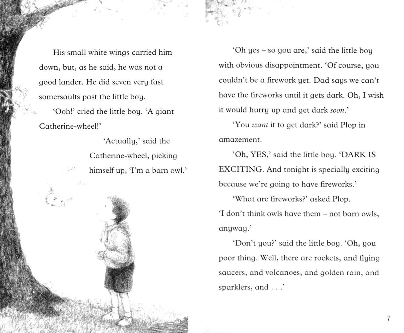 "Dark is nasty" he says and so he won't go hunting with his parents. Mrs Barn Owl sends him down from his nest-hole to ask about the dark and he meets a little boy waiting for the fireworks to begin, an old lady, a scout out camping, a girl who tells him about Father Christmas, a man with a telescope and a black cat who takes him exploring.