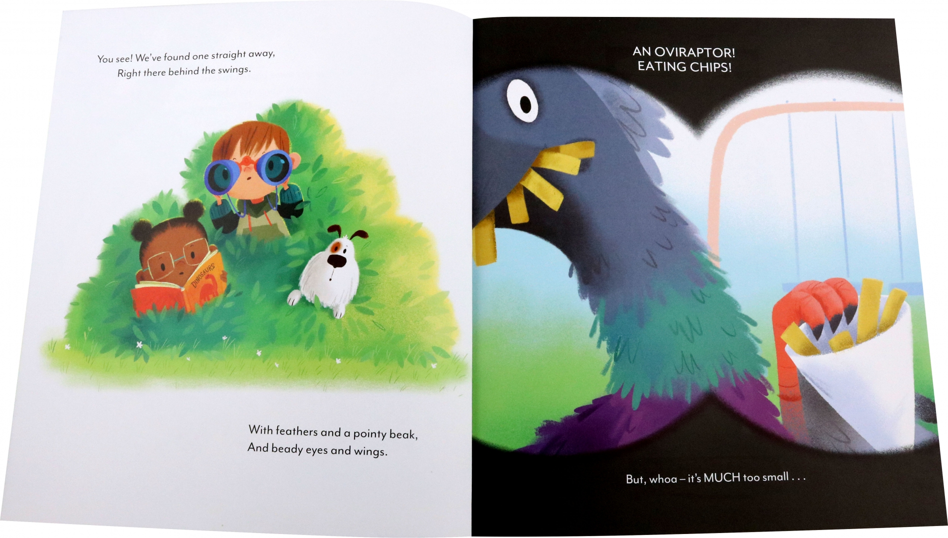 Join two little dino-fans determined to spot some dinosaurs on their day out at the park. It isn't long before they're in luck... behind the swings is an oviraptor!