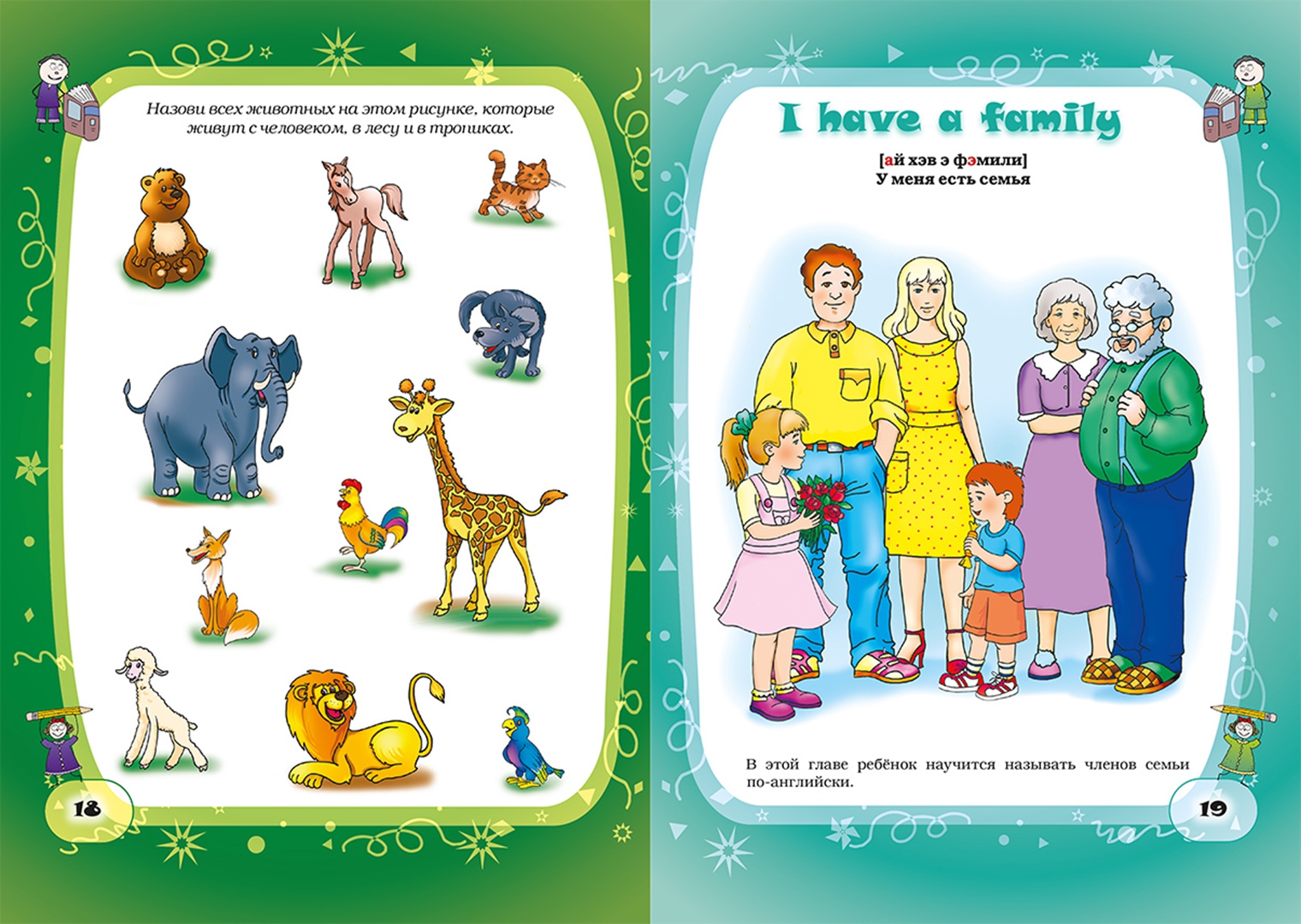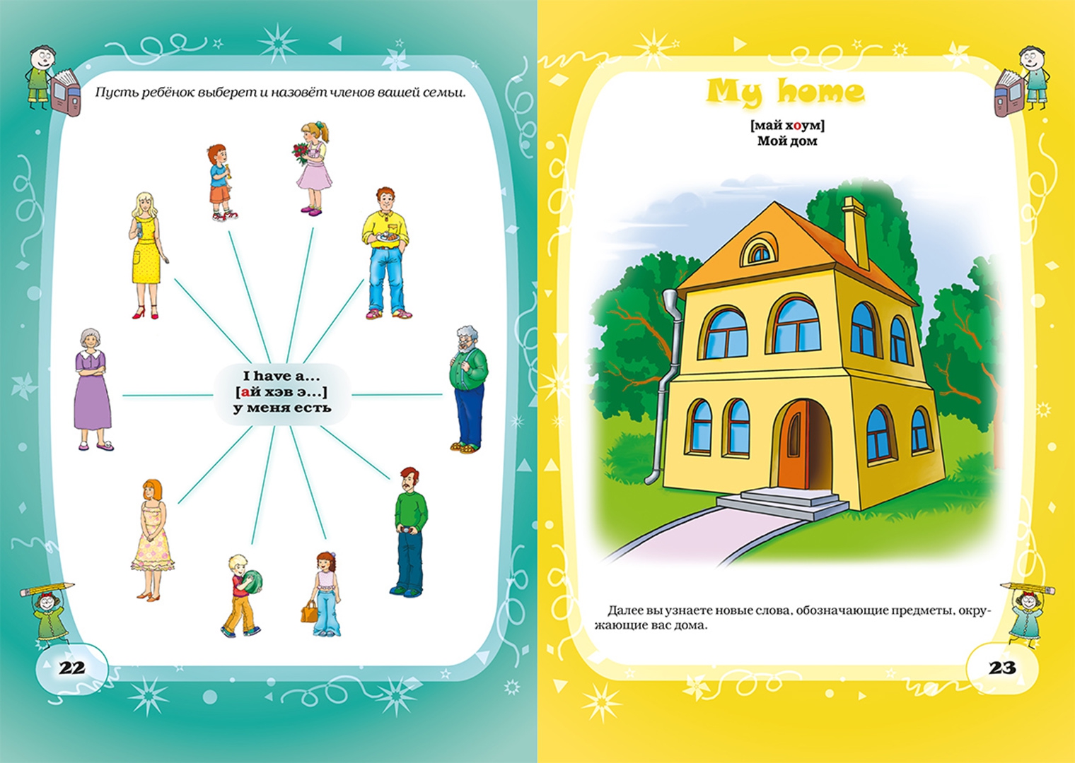Вместе со своим малышом вы узнаете, как приветствовать друг друга по-английски, какие предметы окружают вас в вашем доме, как называются члены вашей семьи и многое другое.