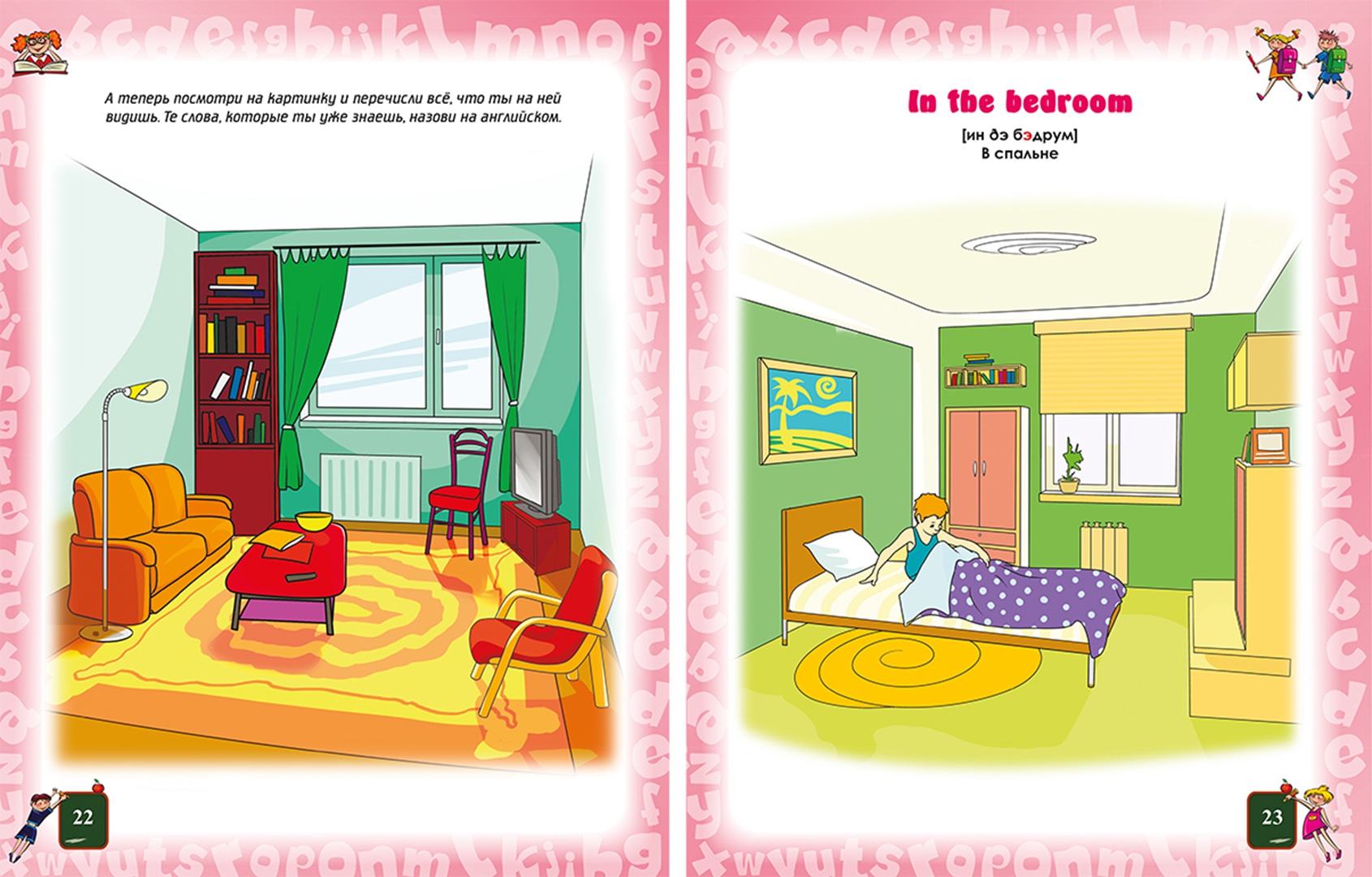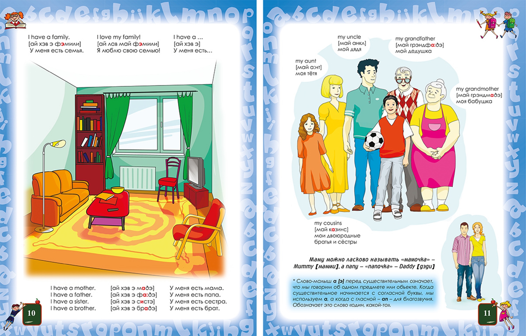 Эта полезная красочная книга поможет вашему ребенку сделать первые шаги в изучении английского языка. Яркие иллюстрации, интересные задания и весёлые стихи сделают обучение увлекательным, похожим на игру. Вместе со своим малышом вы узнаете, как по-английски называются члены вашей семьи, какие предметы окружают вас в вашем доме, как рассказать про погоду на улице, и многое другое. Приглашаем вас и вашего ребёнка в путешествие по миру английского языка!