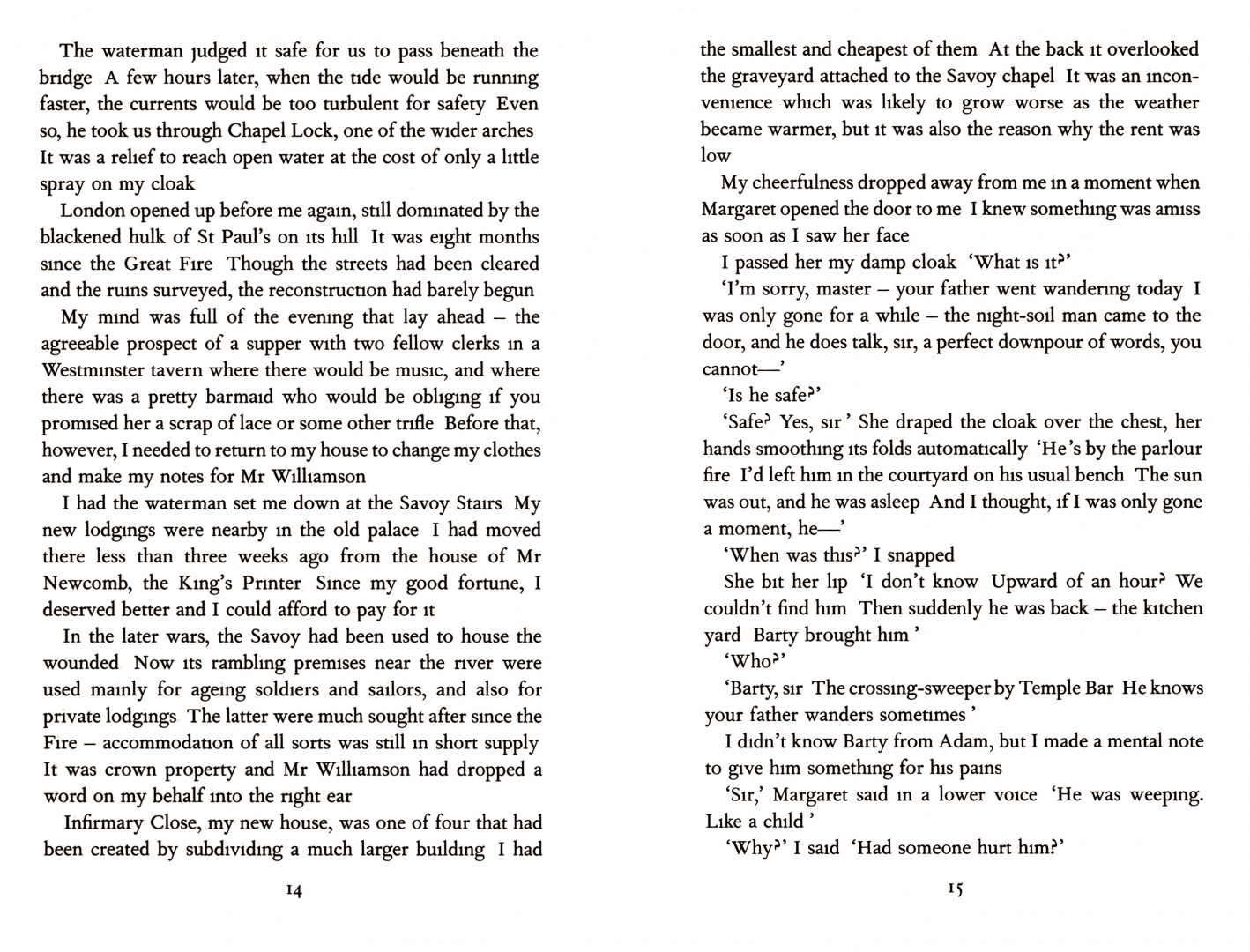 James Marwood, a traitor's son, is thrust into this treacherous environment when his father discovers a dead woman in the very place where the Fire Court sits. The next day his father is run down. Accident? Or another murder…?
