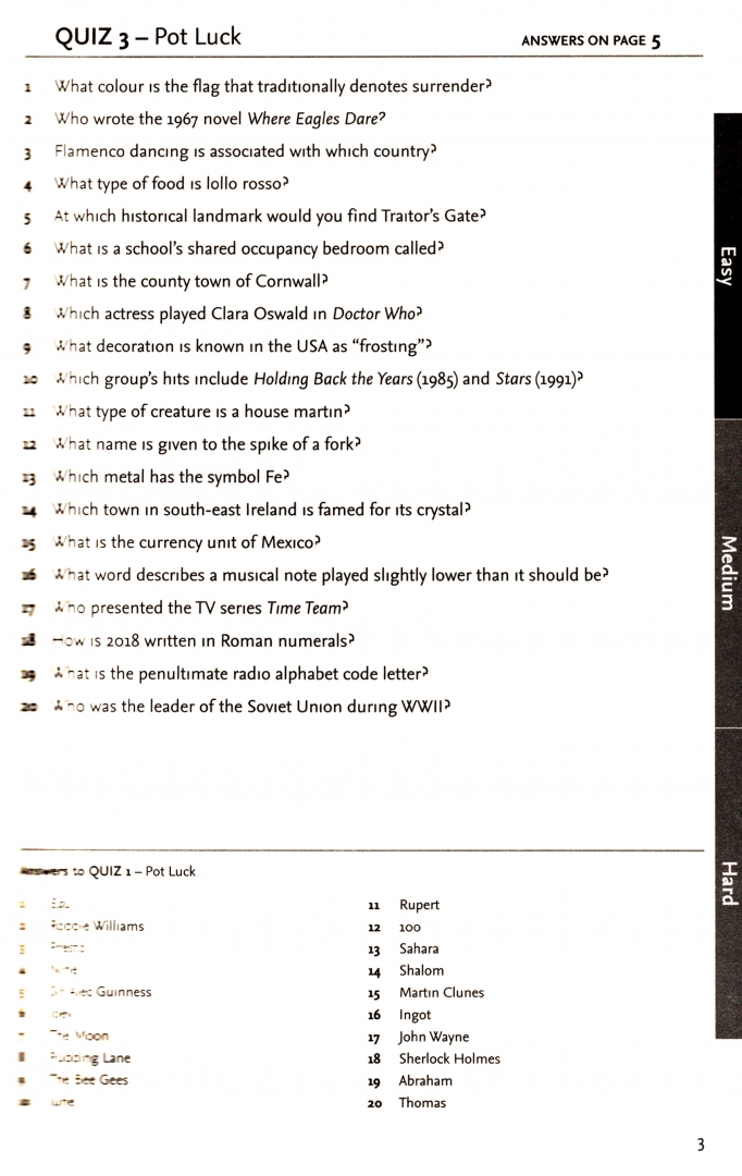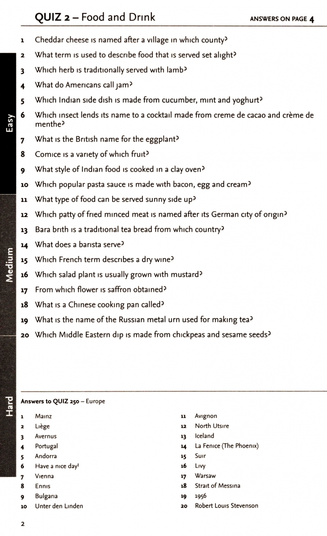 These quizzes are suitable for all ages. good clean fun for all. The answers are quick and easy to find so that anyone can pick this up and become a quiz master or train for the next challenge.