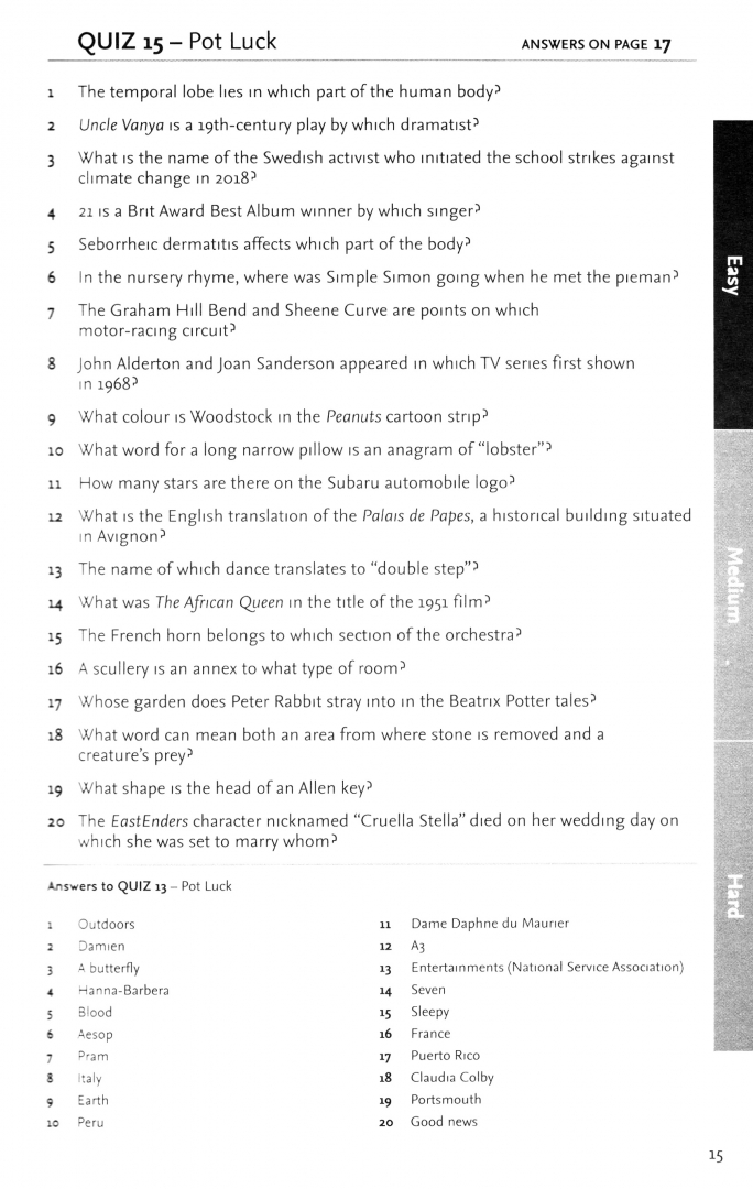 A: 500 quizzes covering everything from pop stars to death stars. Each round is a mixture of themes and potluck, with the questions heading from friendly teasers to ones that will scramble even an egghead’s brains.