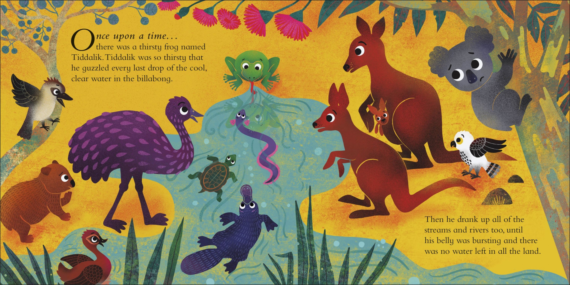 Once Upon a Time... there was a Thirsty Frog follows the tale of the very thirsty frog who drank all the water in the land! Tiddalik, the frog, has to learn how to share so that the other animals can also quench their thirst. What will the other animals do? Will Tiddalik ever learn how to share?