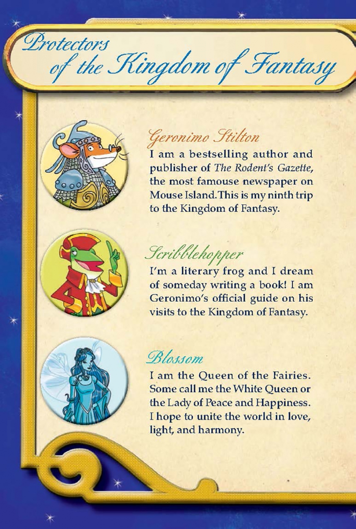 I, Geronimo Stilton, was called to the Kingdom of Fantasy for the ninth time! Blossom, Queen of the Fairies, had disappeared, along with three powerful magical objects: The Book of a Thousand Spells, the Crystal Sphere, and the Whispering Wand. If those objects ended up in the wrong hands, they could destroy the whole realm!