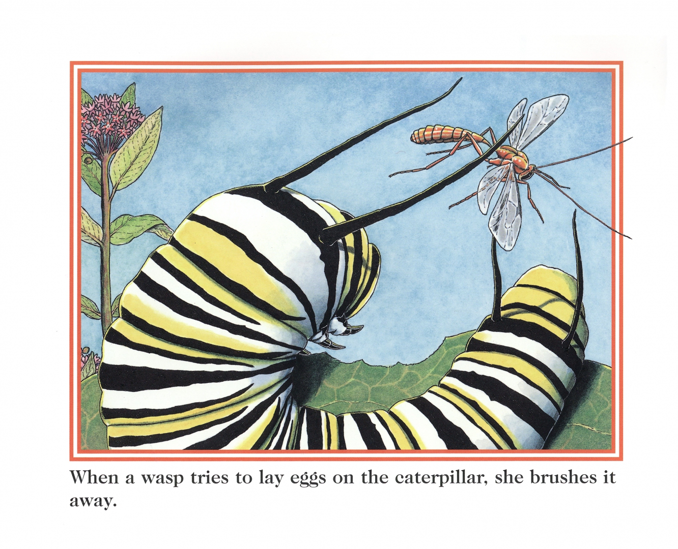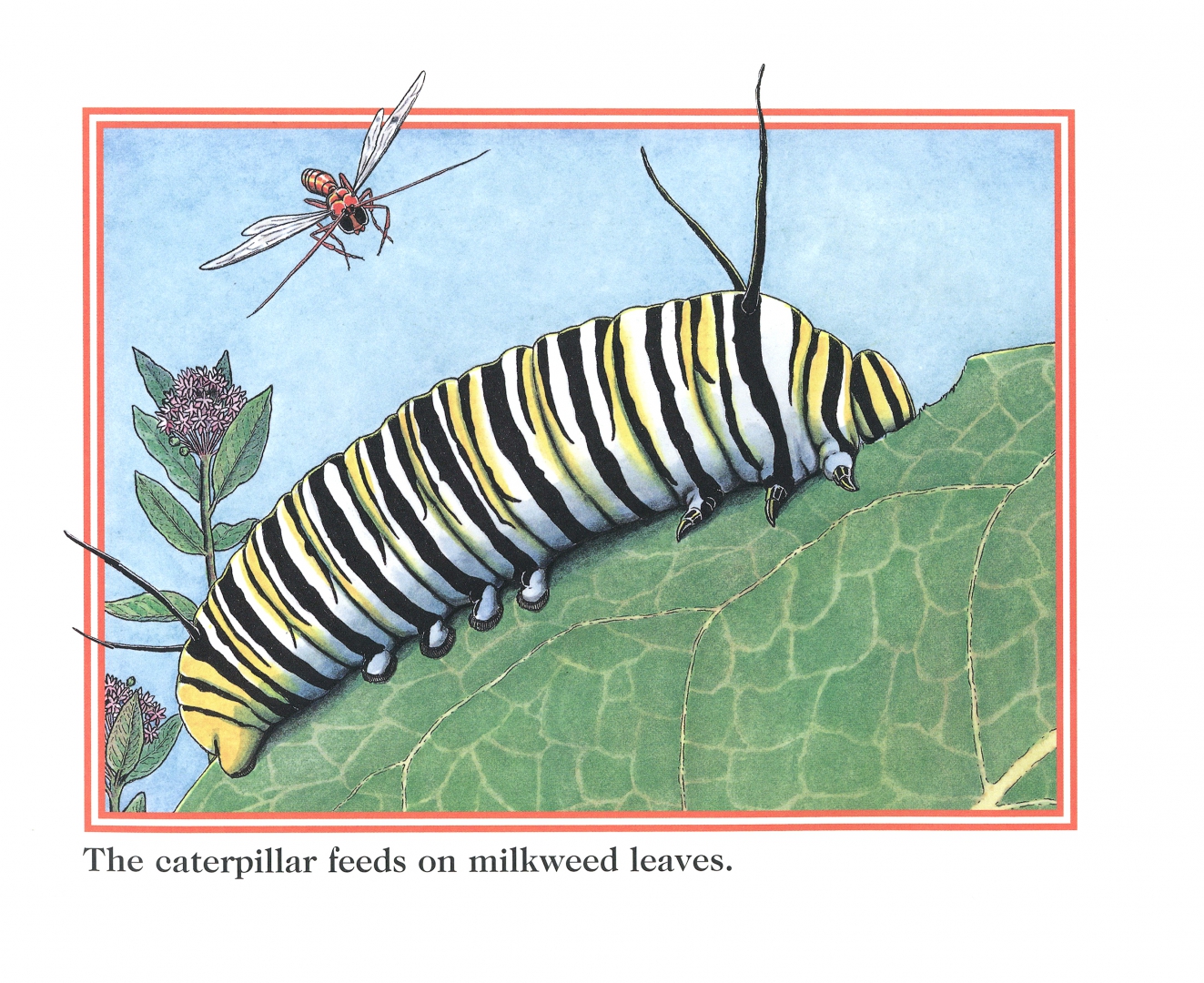 The amazing life cycle of the monarch butterfly is revealed through simple, clear text and drawings, from egg to catterpillar to full grown butterfly who lays eggs of her own after flying from to mexico and back. Important words are written in italics with a glossary in the back. A good blend of science and story.