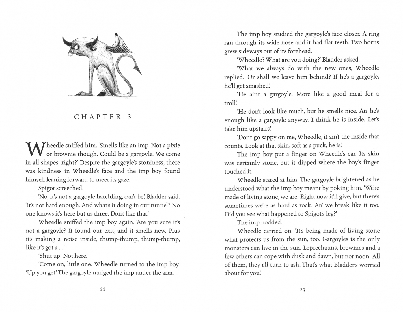 This is the story of a creature who is both strange and unique. When he hatches down in the vast underground lair wh ere monsters dwell, he looks just like a human boy – much to the disgust of everyone watching. Even the grumpy gargoyles who adopt him and nickname him 'Imp' only want him to steal chocolate for them fr om the nearby shops. He's a child with feet in both worlds, and he doesn't know wh ere he fits.