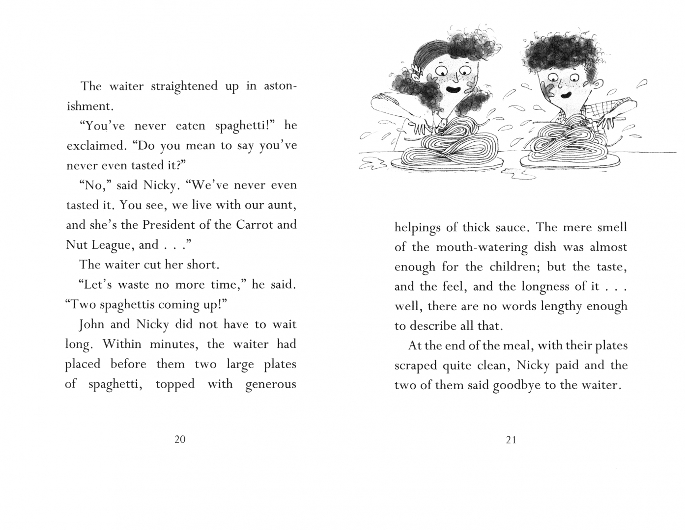 John and Nicky would give anything in the world for a bowl of chips or a piece of chocolate cake, but they live with their strange aunty and she won't let them eat anything that's not raw! One day they sneek out and slurp down a plate piled high with spaghetti. Now they want more ... Lucky for them, there's a competition to visit the spaghetti factory and eat as much as you like. What will aunty say?
