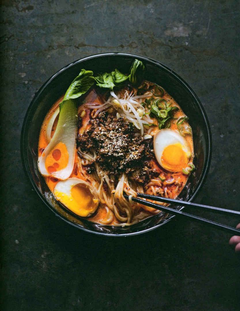 Its perfect surface intricately patterned with tiny droplets of oil; the flavour enhanced with algae, miso, dried fungi and fish sauce. Thin and springy noodles nestle in the base, while a sashimi-marinated cut of pork or chicken sits atop, the meat meltingly tender after up to 48 hours of simmering. A bobbing soya-marinated egg and an array of toppings add a colourful finishing touch.
