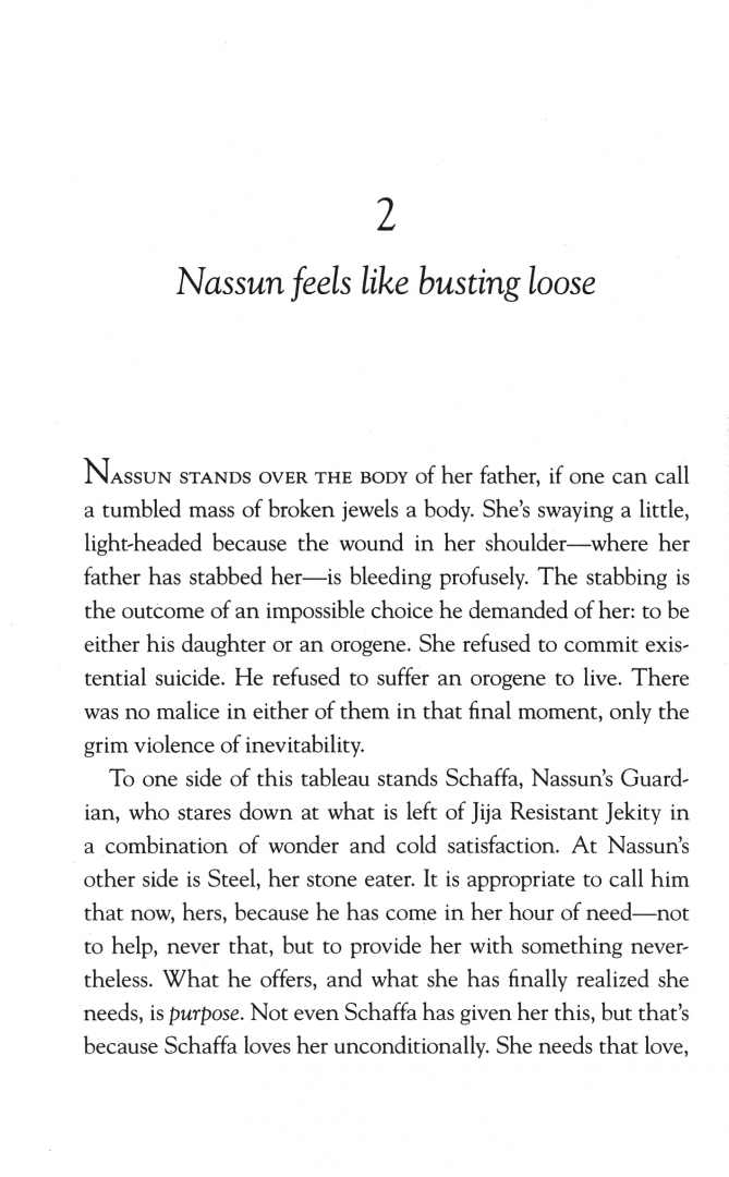 For Nassun, her mother's mastery of the Obelisk Gate comes too late. She has seen the evil of the world, and accepted what her mother will not admit: that sometimes what is corrupt cannot be cleansed, only destroyed.