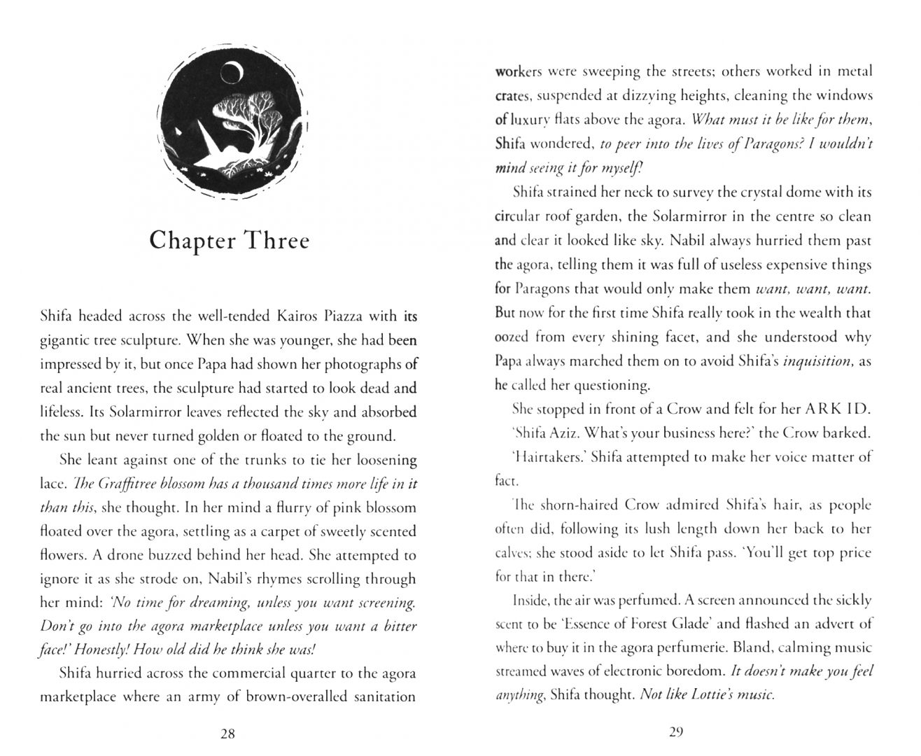 Shifa and her brother, Themba, live in Kairos City with their father, Nabil. The few live in luxury, whilst the millions like them crowd together in compounds, surviving on meagre rations and governed by Freedom Fields - the organisation that looks after you, as long as you opt in.