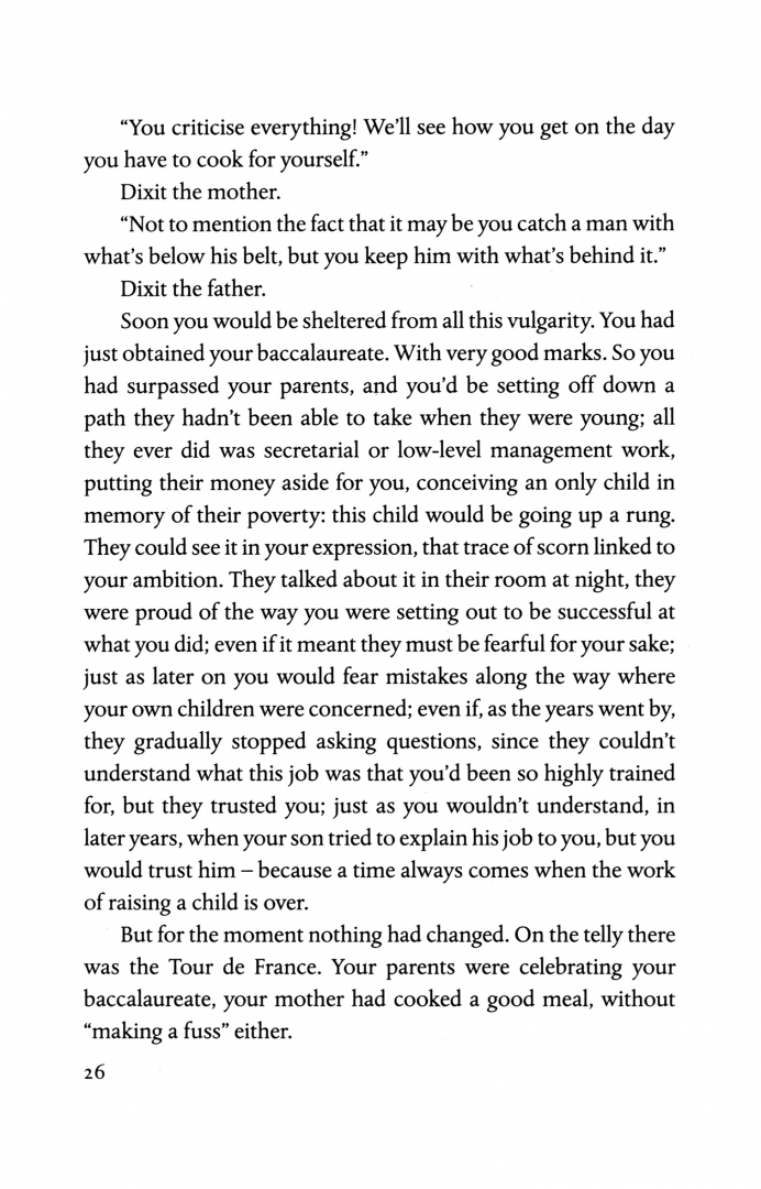 She has doting parents, does well at school, finds a loving husband after one abortive attempt at passion, buys a big house with a moonlit terrace, makes decent money, has children, changes jobs, retires, grows old and dies. All in the comfort that the middle-classes have grown accustomed to.