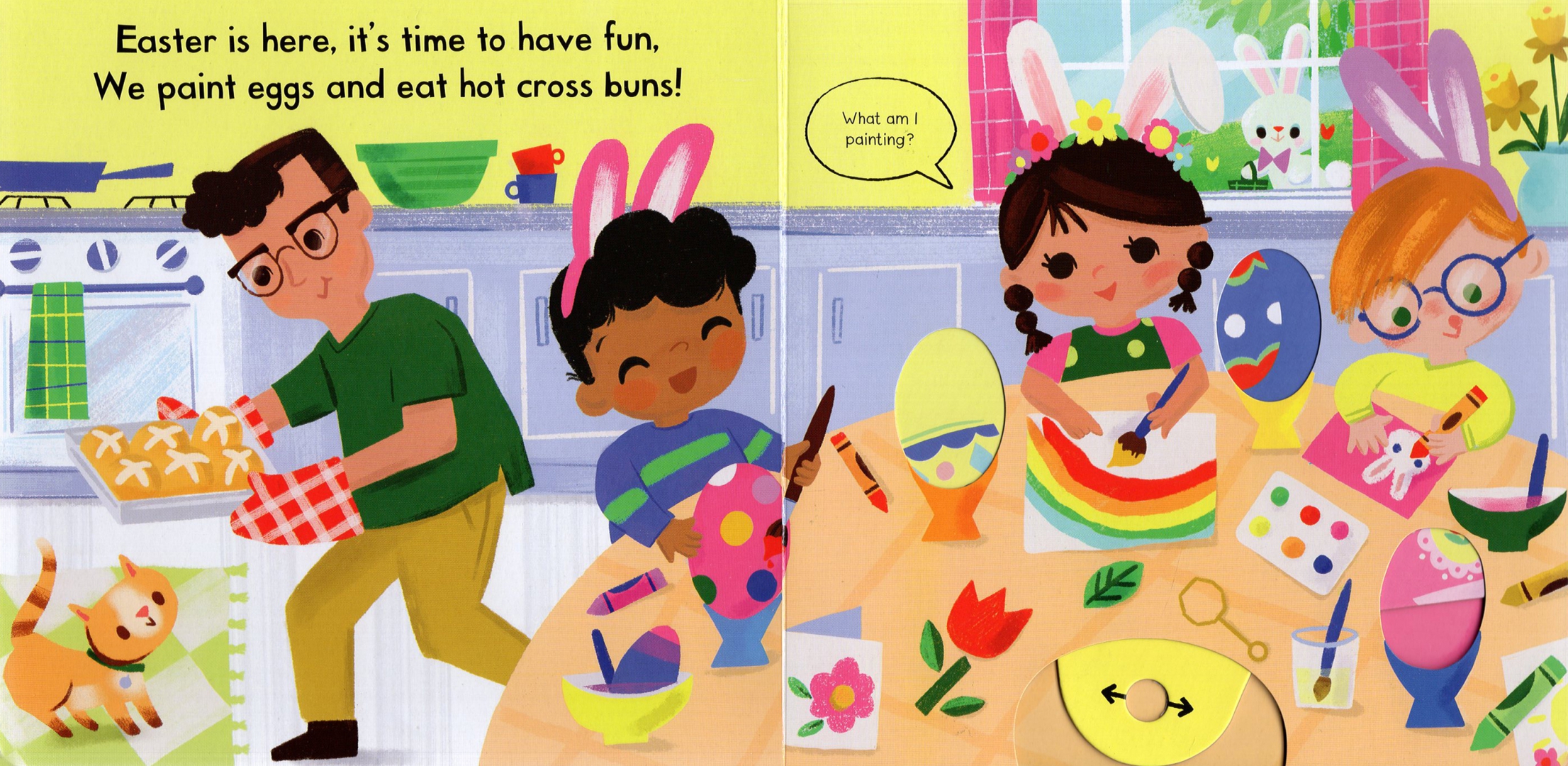 Push, pull and slide the tabs to join in with the Busy Easter celebrations! Bake delicious hot cross buns, follow the Easter bunny in an egg hunt, then celebrate with all your friends.