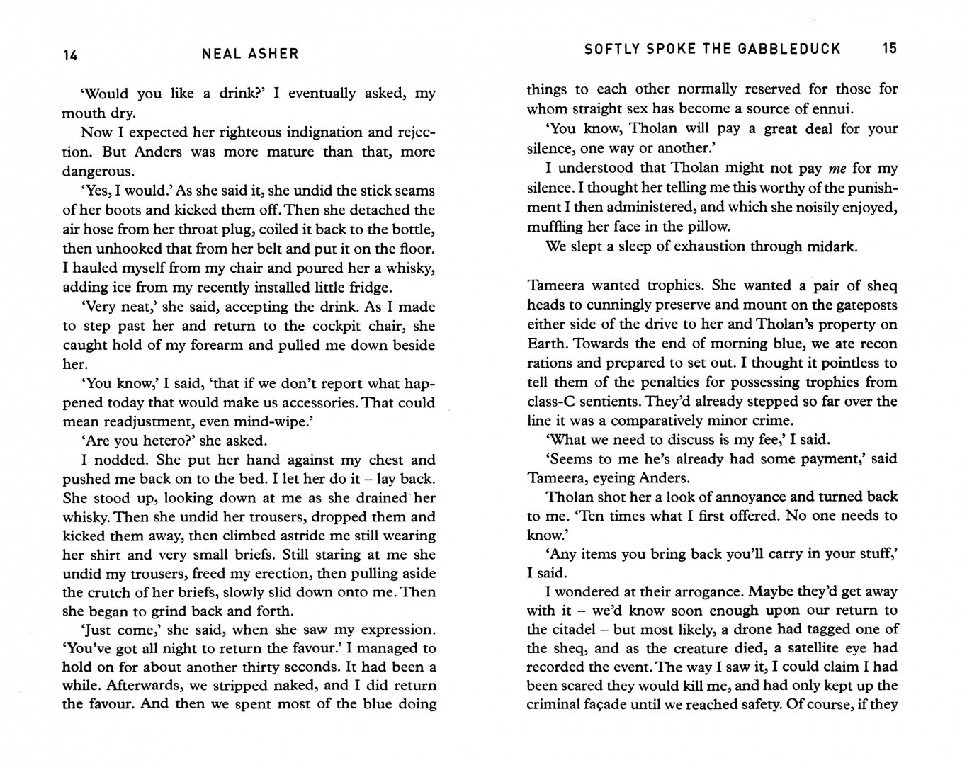 No one does weird, wonderful and downright gruesome aliens better than Neal Asher, so prepare to visit his favourites. Sample the lifestyles of creatures such as the gabbleduck and the hooder, as Asher takes you on a wild ride into his vividly-imagined futures.