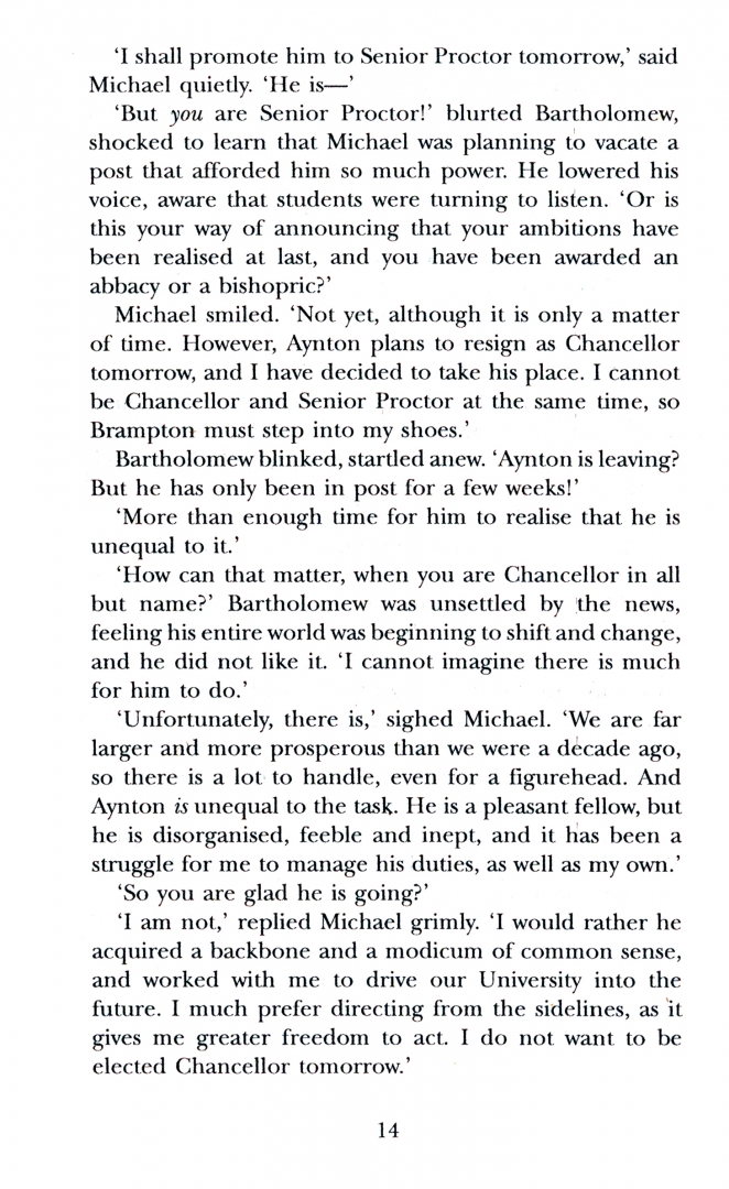 In 1360, the Great Bridge over the River Cam is close to collapse. To repair it will cost the town and the University dear, especially if its rotten wood is replaced by more durable stone. As arguments rage over raising the money other, equally heated, differences are coming to the boil over the election of a new Chancellor. While the majority support Brother Michael for the post, at least one of his opponents aims to seize it by fair means or foul. Then the discovery of a body under the bridge and the disappearance of two scholars throws a more sinister shadow over both disputes.